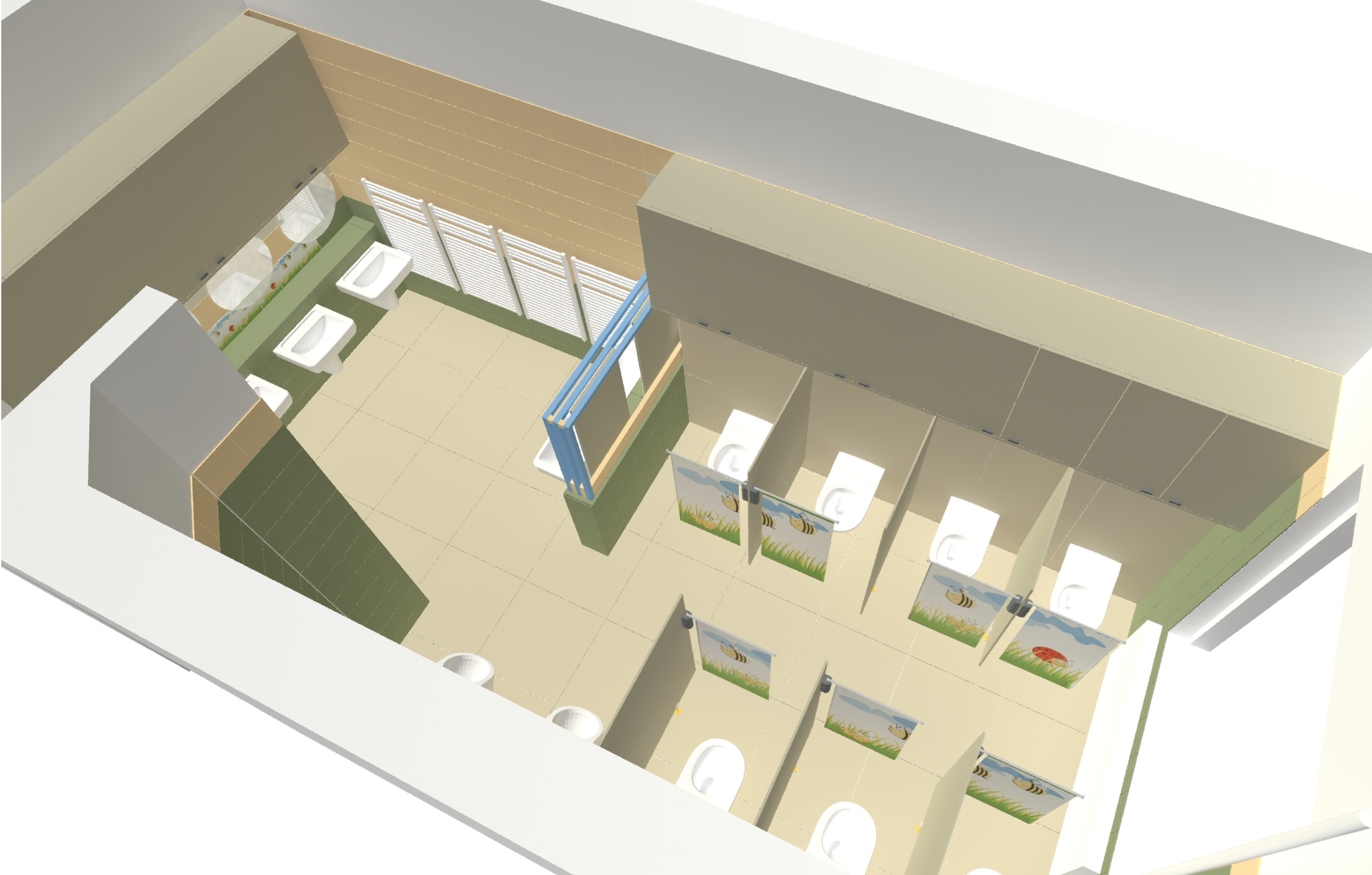 A hat mosdót, hét WC-t és két piszoárt tartalmazó mosdó tervezésekor különös figyelmet kapott, hogy óvodásoknak készül, így ennek megfelelően színekben gazdag és gyermekek számára könnyedén használható megoldásokban (gyerek fali-WC, gyerek csaptelep) bővelkedik majd az átalakulást követően.