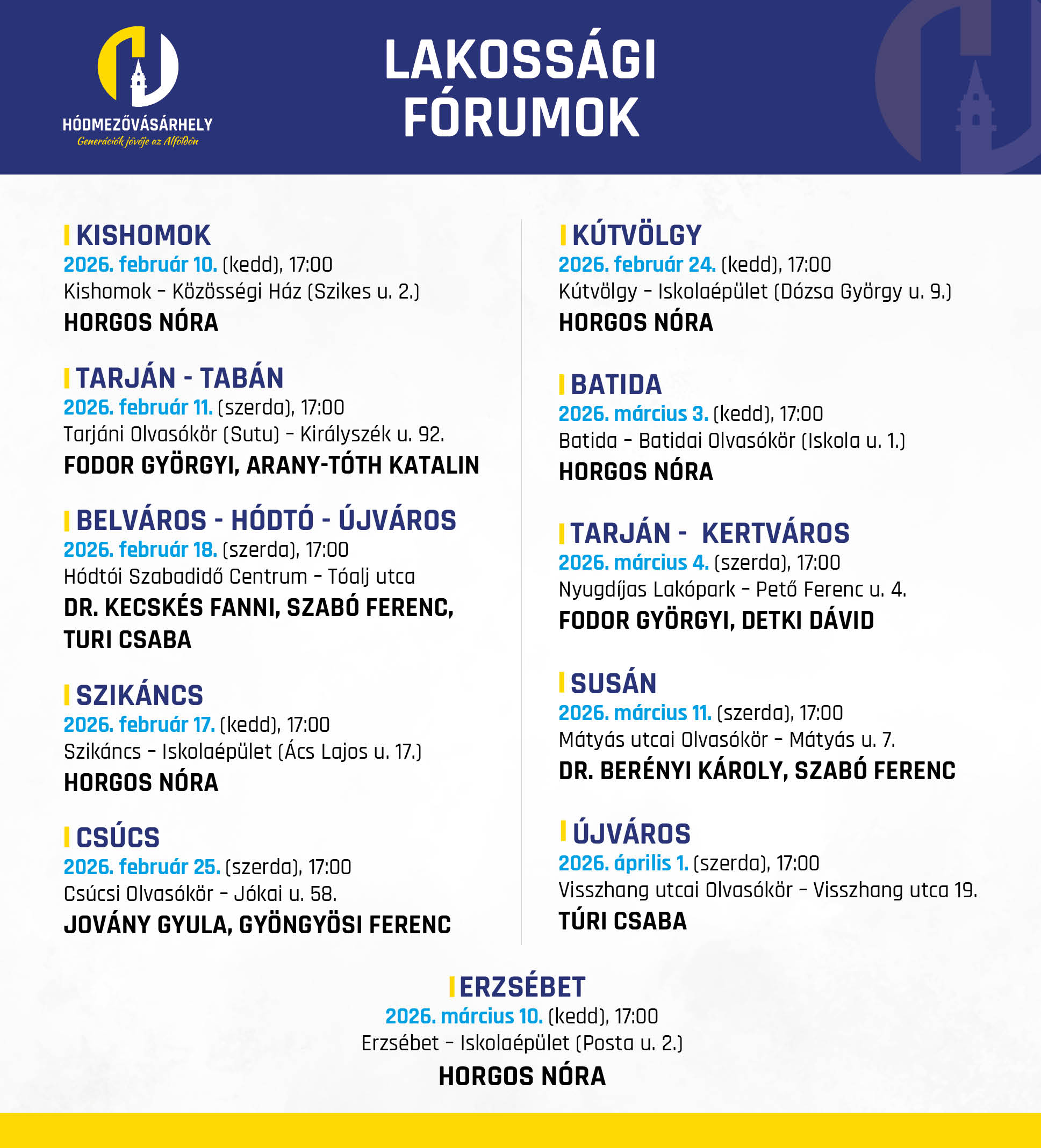 A városvezetés februárban és március elején is folytatja a külterületi lakossági fórumok sorozatát. A találkozók célja változatlan: közvetlen párbeszéd a helyben élőkkel, a mindennapokat érintő problémák és javaslatok meghallgatása, valamint a fejlesztési elképzelések ismertetése.