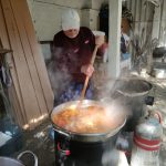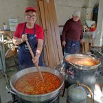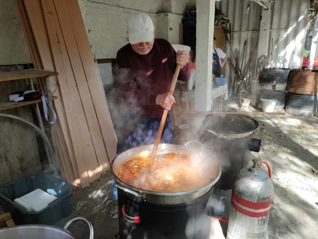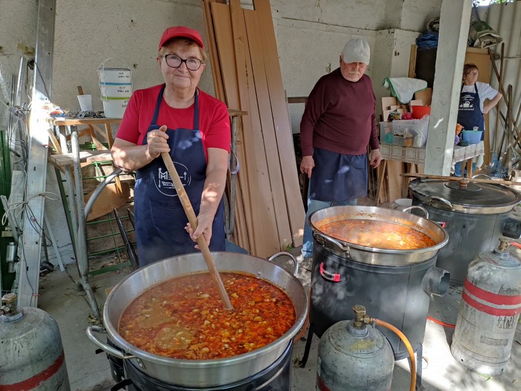 Három jókora kondérban rotyogott az összesen háromszáz adag gulyás ma délelőtt a Csúcsi Olvasókör Jókai utcai épületének udvarán, hogy aztán délben megkezdődjék az immár tizenkilencedik ételosztás, a felajánló Berényi Károly, a Sanyi pékség valamint a tepertős pogácsát készítő Sipos Róbert és a fagylaltot felajánló Tolnai Imre jóvoltából.
