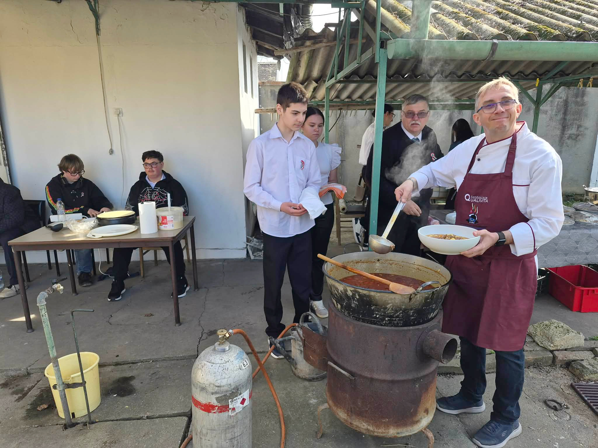 A műsor után az iskola oktatói és diákjai közösen láttak munkához: az udvaron rotyogó, laktató gulyásleves illata hamar belengte a környéket, a desszertként kínált, frissen sült palacsinta pedig feltette a koronát az ebédre.