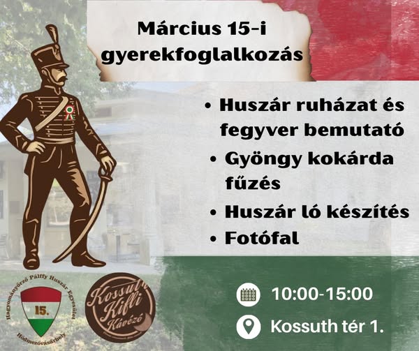 A Kossuth téren található Kossuth Kifli Kávézóban március 15-én, vasárnap 10-15 óra között gyerekfoglalkozásokkal várják az érdeklődő családokat. A programok célja, hogy a gyerekek kreatív és élményközpontú módon ismerkedjenek meg a huszárok világával és az ünnep szimbólumaival.