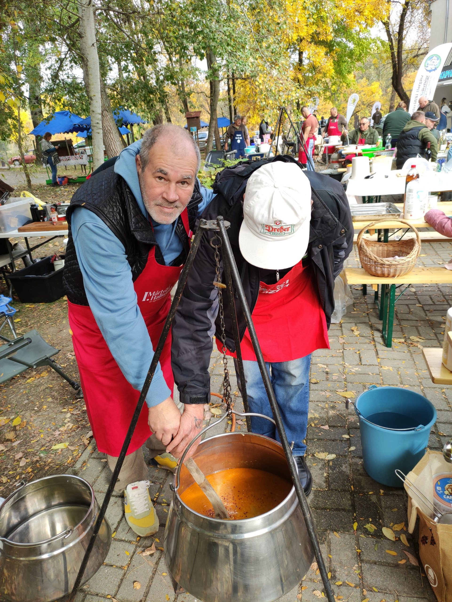– Tiszai halászlé készül vegyes alaplével, amiben van keszeg, kárász, busa, amur, ponty és szürkeharcsa-csont. Ebből a vegyes alapléből filézett pontyhalászlé lesz – tudtuk meg Szunyi Krisztiántól és Nagy László csapatkapitánytól. Azt is elárulták, hogy ez nem bonyolult étel: a keszeget és a kárászt versenyen kívül megsütötték, maguknak pedig harcsapaprikást is főznek túrós csuszával.