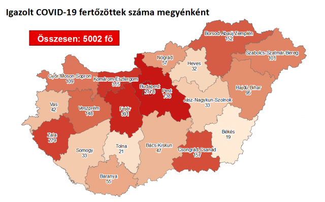 Harminckettővel, 5002-re emelkedett az azonosított koronavírus-fertőzöttek száma Magyarországon, újabb elhunyt nincs – közölte a koronavirus.gov.hu szerdán.
