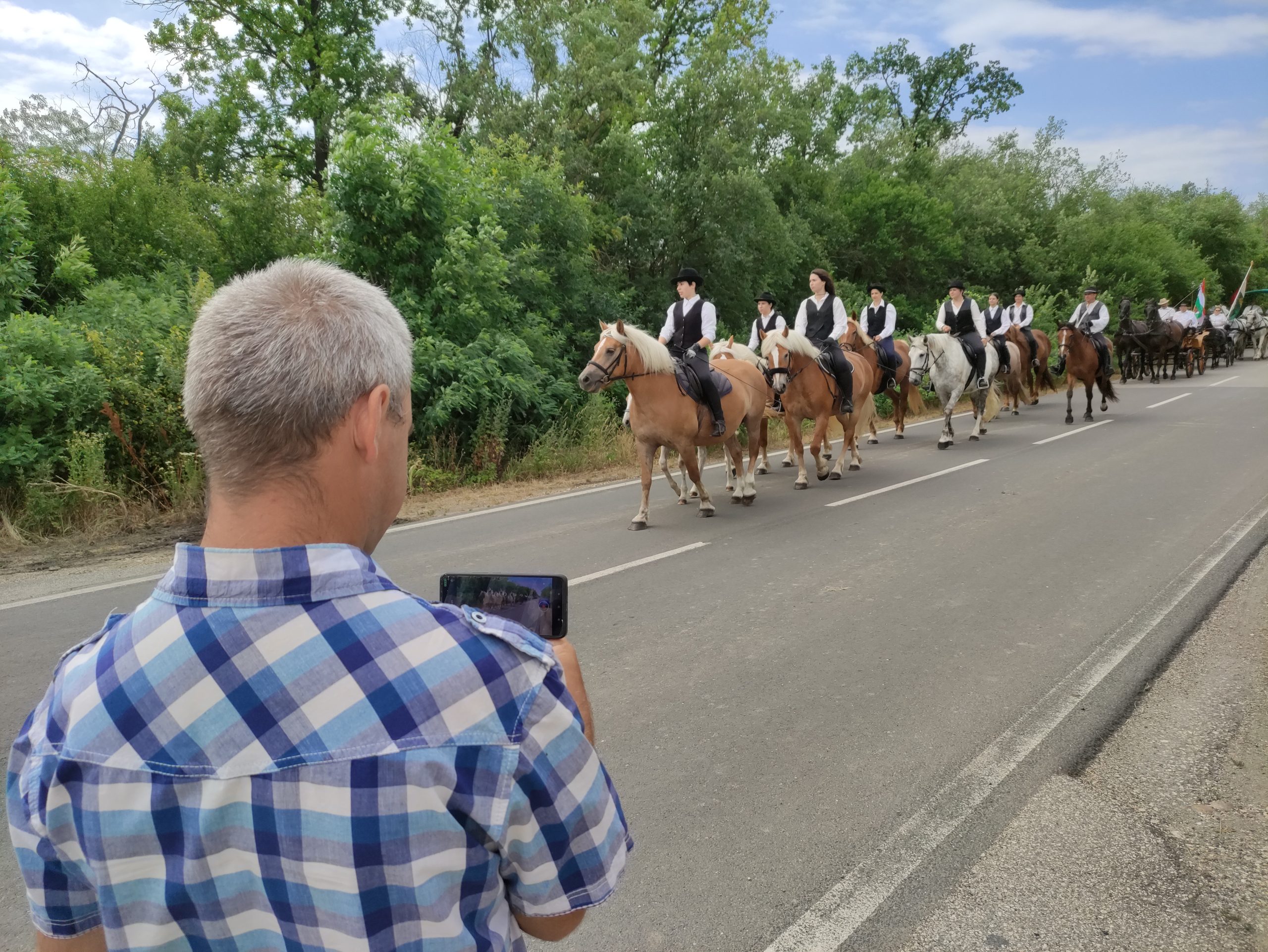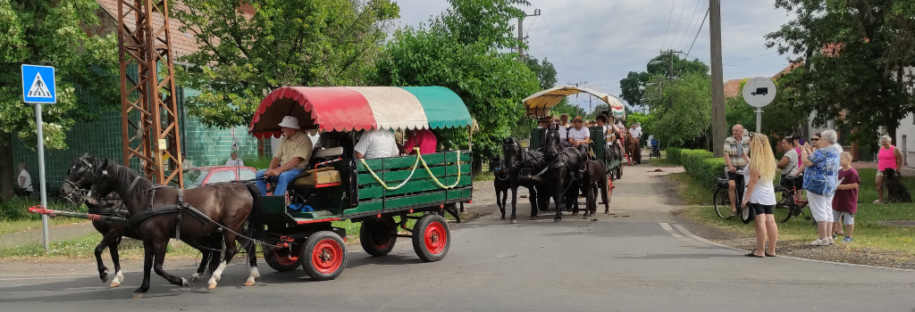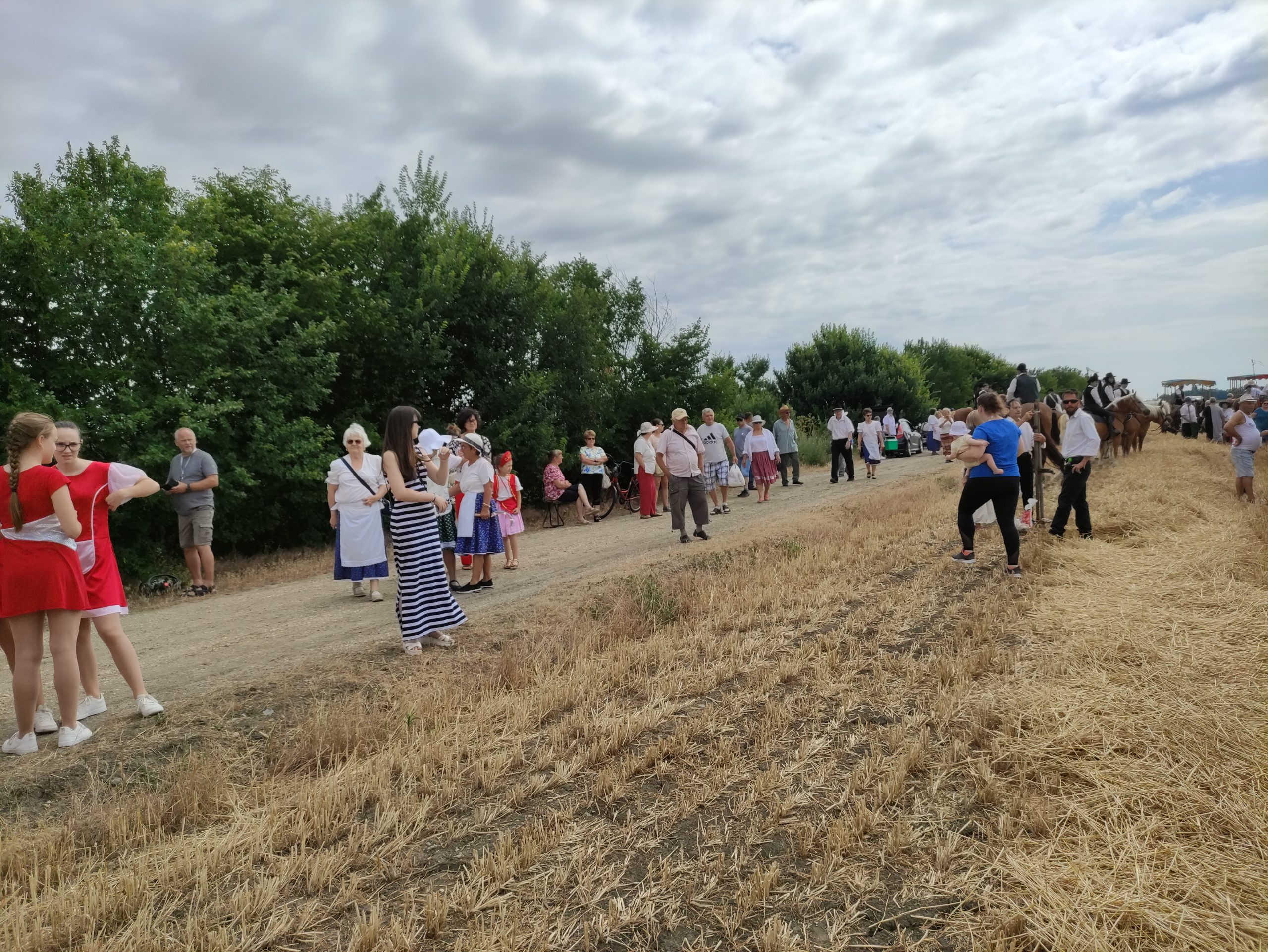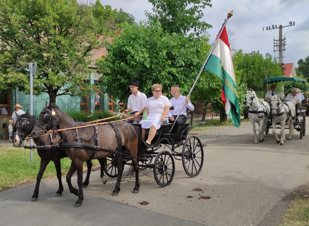Az olvasókörtől az aratóünnepi lovas, fogatos menet a mazsorettek vezetésével indult útnak a Szántó Kovács János, Teleki, Vöröskereszt utcákon haladva a Kutasi úton, végül a Jókai utcán és a Rárósi úton haladva érték el a gazda földjét.