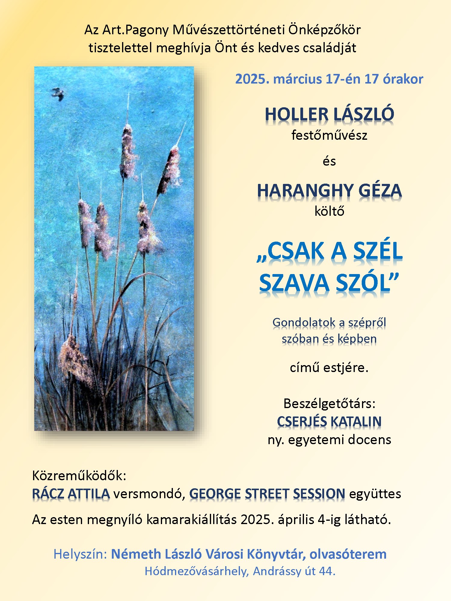 A „Csak a szél szava szól”, Gondolatok a szépről szóban és képben című esten a festőművész és a költő beszélgetőtársa Cserjés Katalin, nyugalmazott egyetemi tanár lesz. Közreműködik Rácz Attila versmondó és a George Street Session zenekar.