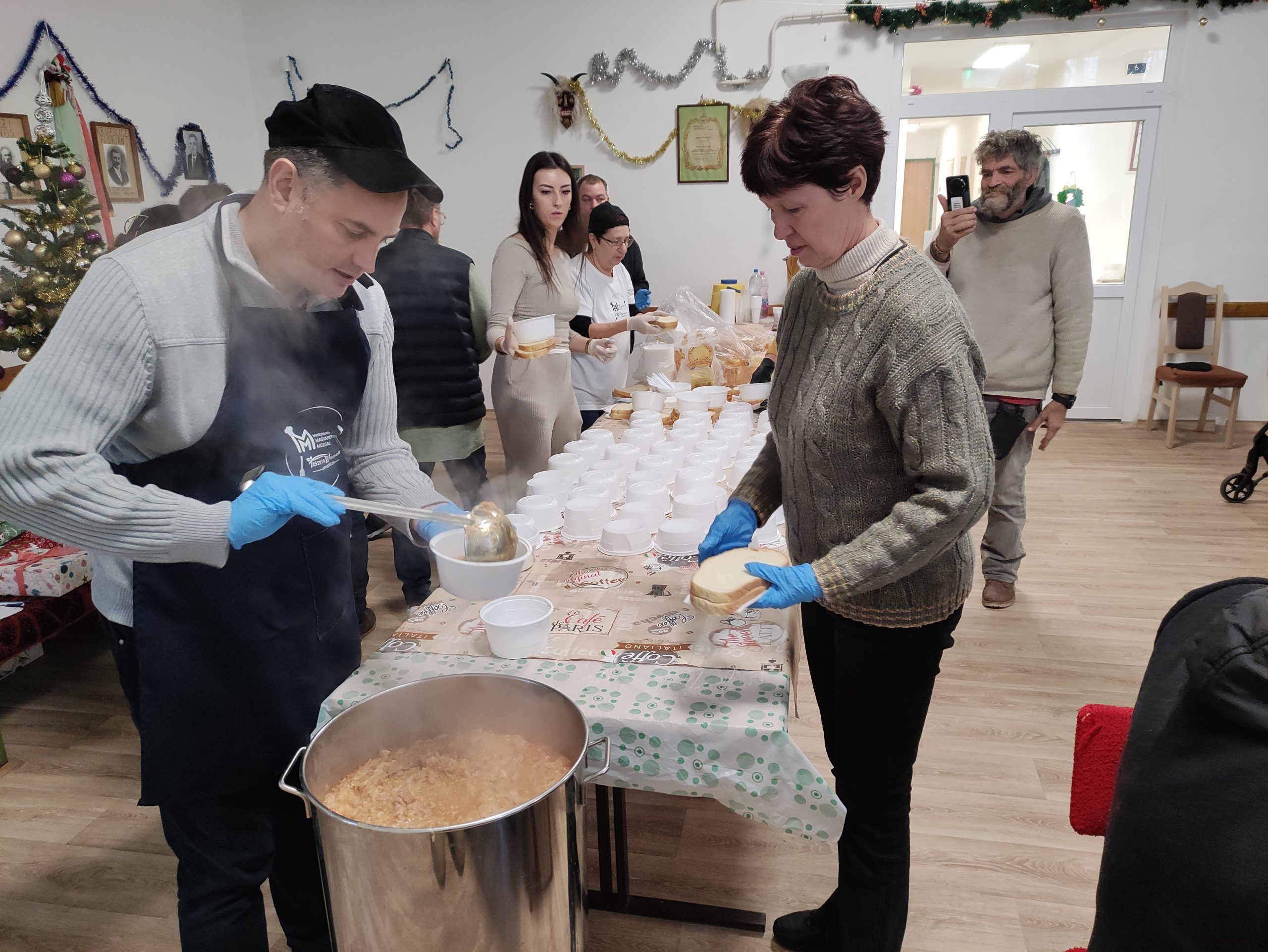 A korábban megszokottól eltérően a két szervezet aktivistái ezúttal nem sorban állva osztották az ételt: a Csúcsi Olvasókörben vasárnap délben rendezett eseményen mindenkihez az asztalhoz vitték ki a főételként készült igazi karácsonyi fogást, a húsos káposztát, valamint az édességet, a bejglit és a szaloncukrot, és természetesen a teát is. Ezúttal tehát nem az étkezni kívánók, hanem az önkéntesek álltak sorba az asztal előtt, hogy Márki-Zay Péter, a Mindenki Magyarországa Mozgalom elnöke merőkanállal mérje ki a forró egytálételt a műanyag tányérokba.