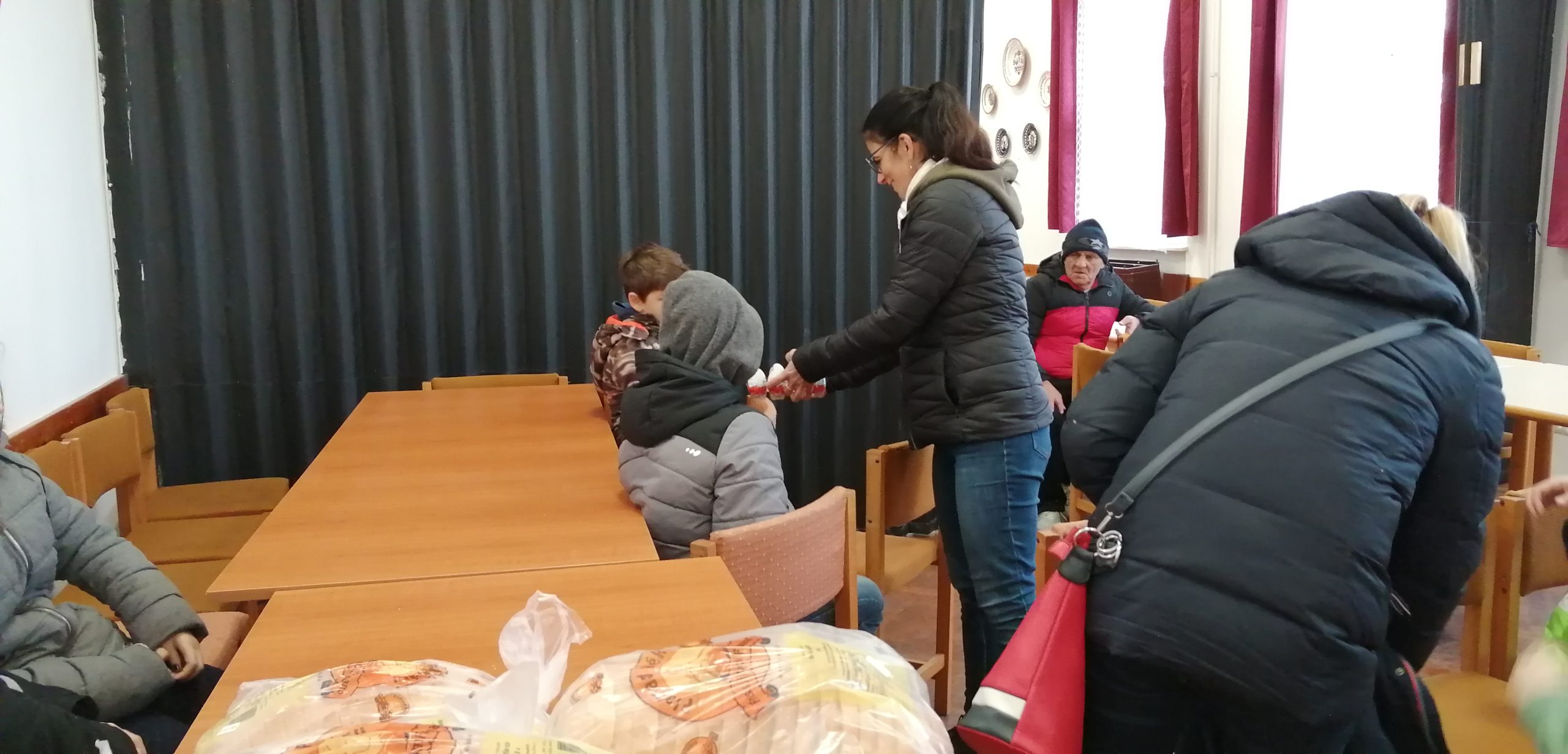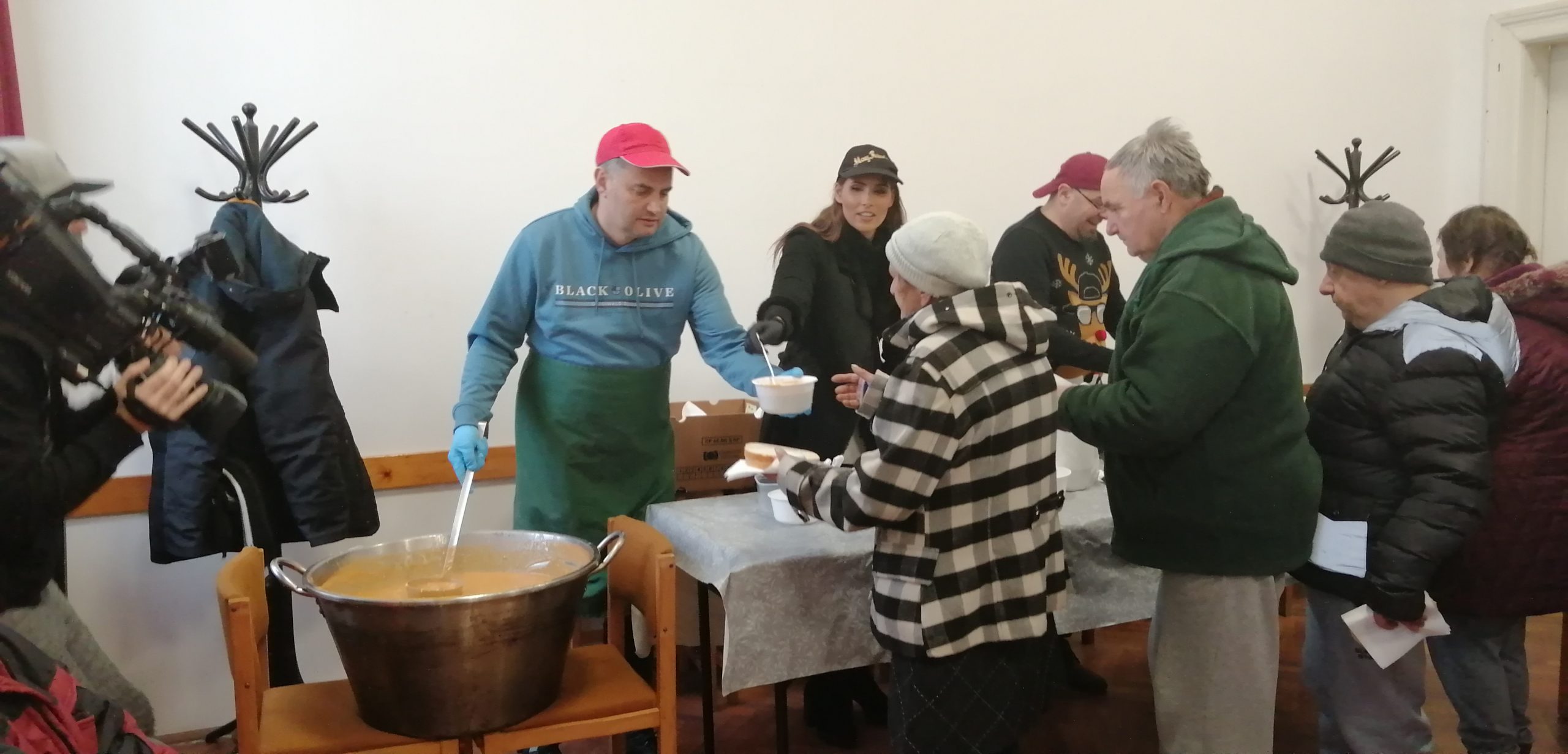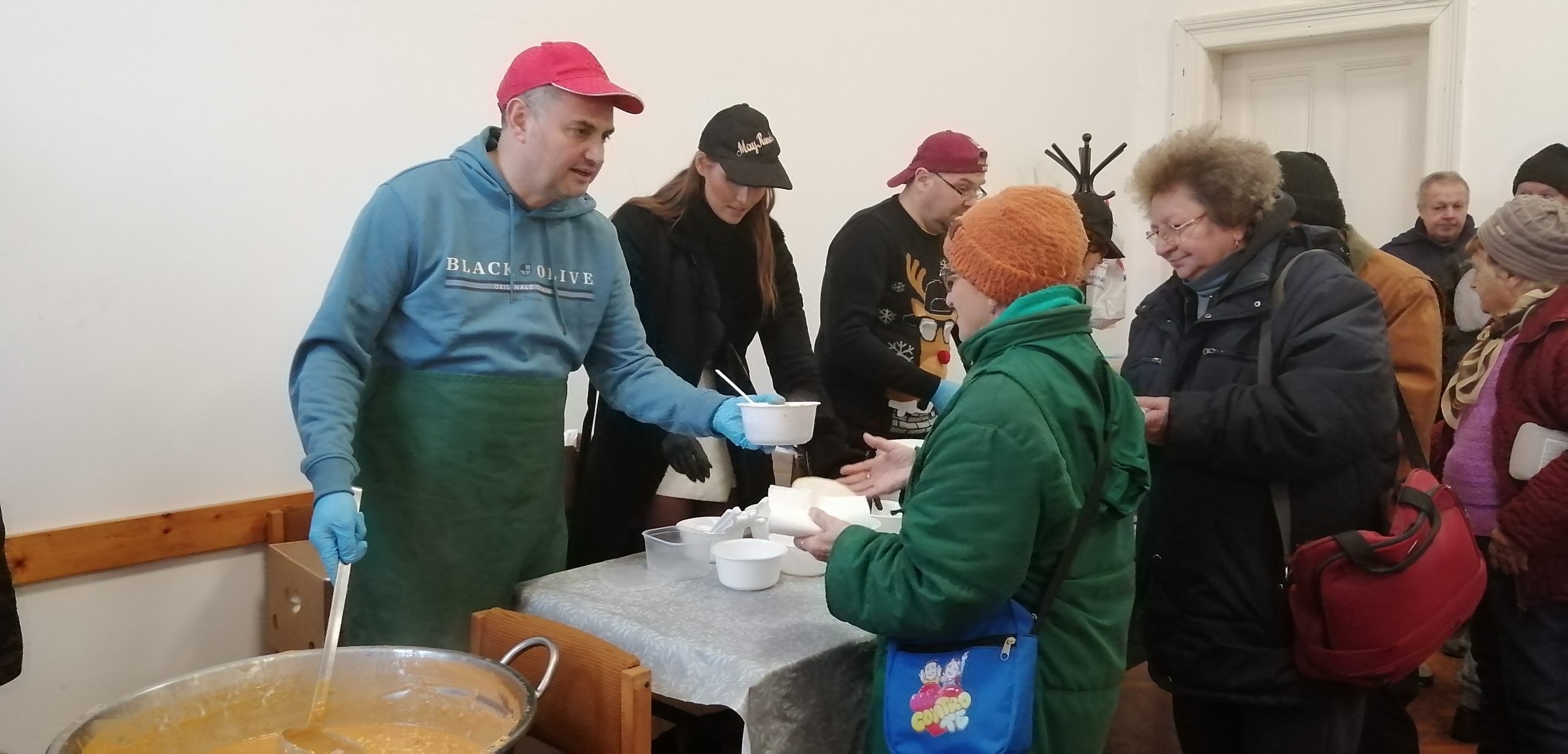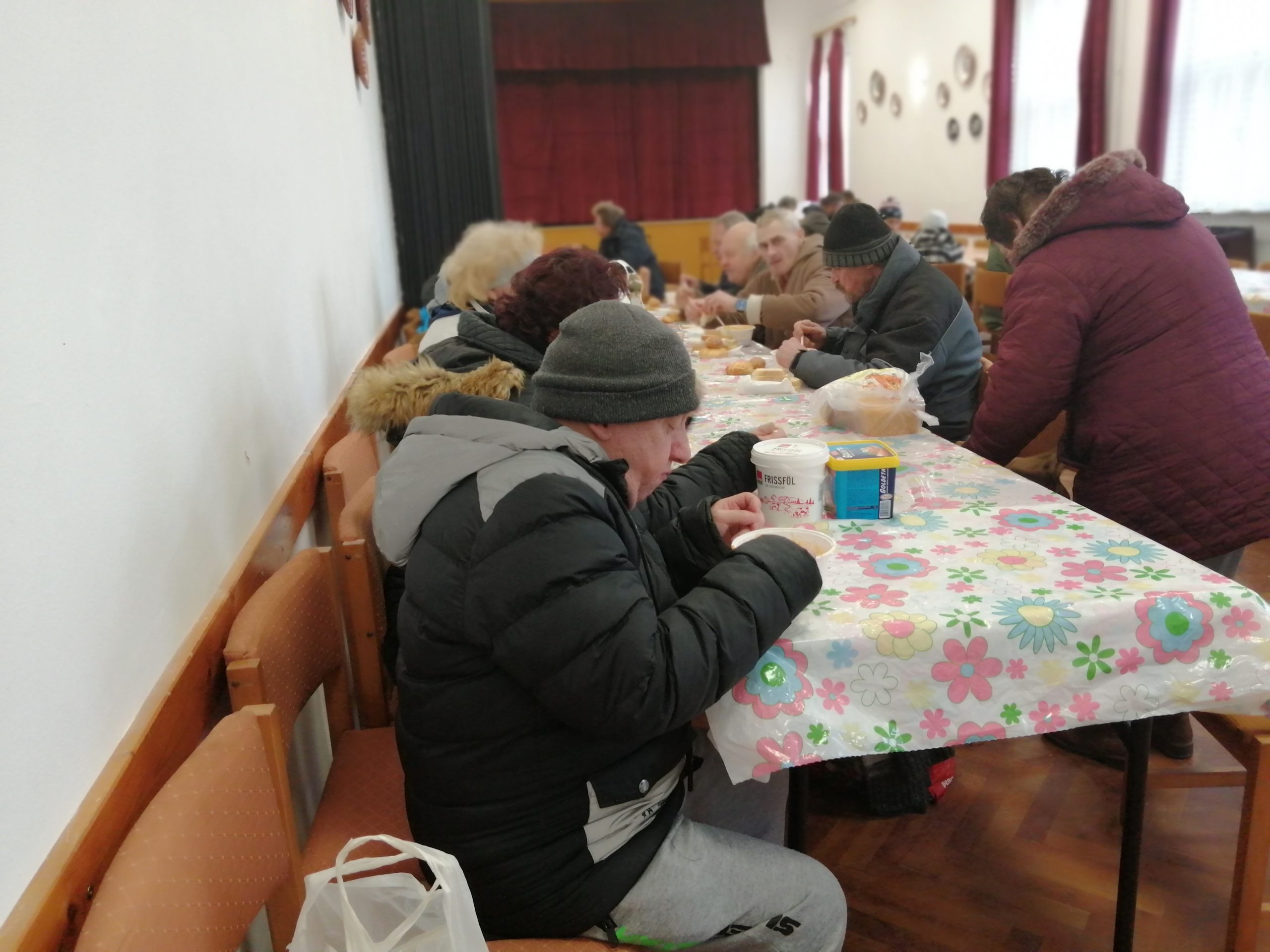 A menü sertéslapockával és szalonnával dúsított krumplis tarhonya, az édesség pedig bejgli volt – legalábbis azoknak, akiknek házhoz vitték az ételt, a többieknek a Magyar Máltai Szeretetszolgálat, ahogy máskor is, most is frissensült Fornetti péksütemény hozott. Czeller Éva, az ételosztások főszakácsa, azt is elárulta, hogy bejgli az ünnepre tekintettel jövő héten is lesz, főételként pedig székelykáposztát fognak készíteni. Hozzátette: minden alkalommal 12-14 személy dolgozik azon, hogy ennyi embernek étel kerülhessen az asztalra. Ehhez jönnek persze hozzá még azok, akik a kihordásban segítkeznek, további 10-15 fő. Az előkészületeket, zöldségek pucolását, a hús feldarabolását már előző nap meg szokták csinálni, így gyorsabban haladnak a főzés délelőttjén. – Mindig igyekszünk abból főzni, ami éppen akciós, a káposztát például már megvettem jövő hétre. Mindent kisebb-nagyobb adományokból finanszírozunk egyébként. Körülbelül 200-220 ezer forintból tudunk kihozni egy alkalmat – tudtuk meg tőle.