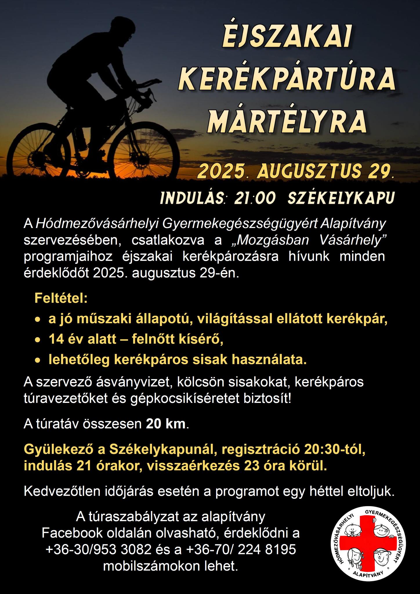 A Hódmezővásárhelyi Gyermekegészségügyért Alapítvány szervezésében, csatlakozva a „Mozgásban Vásárhely” programjaihoz éjszakai kerékpározásra hívnak minden érdeklődőt augusztus 29-én, azaz egy hét múlva. Indulás este 9-kor a népkerti székelykaputól.