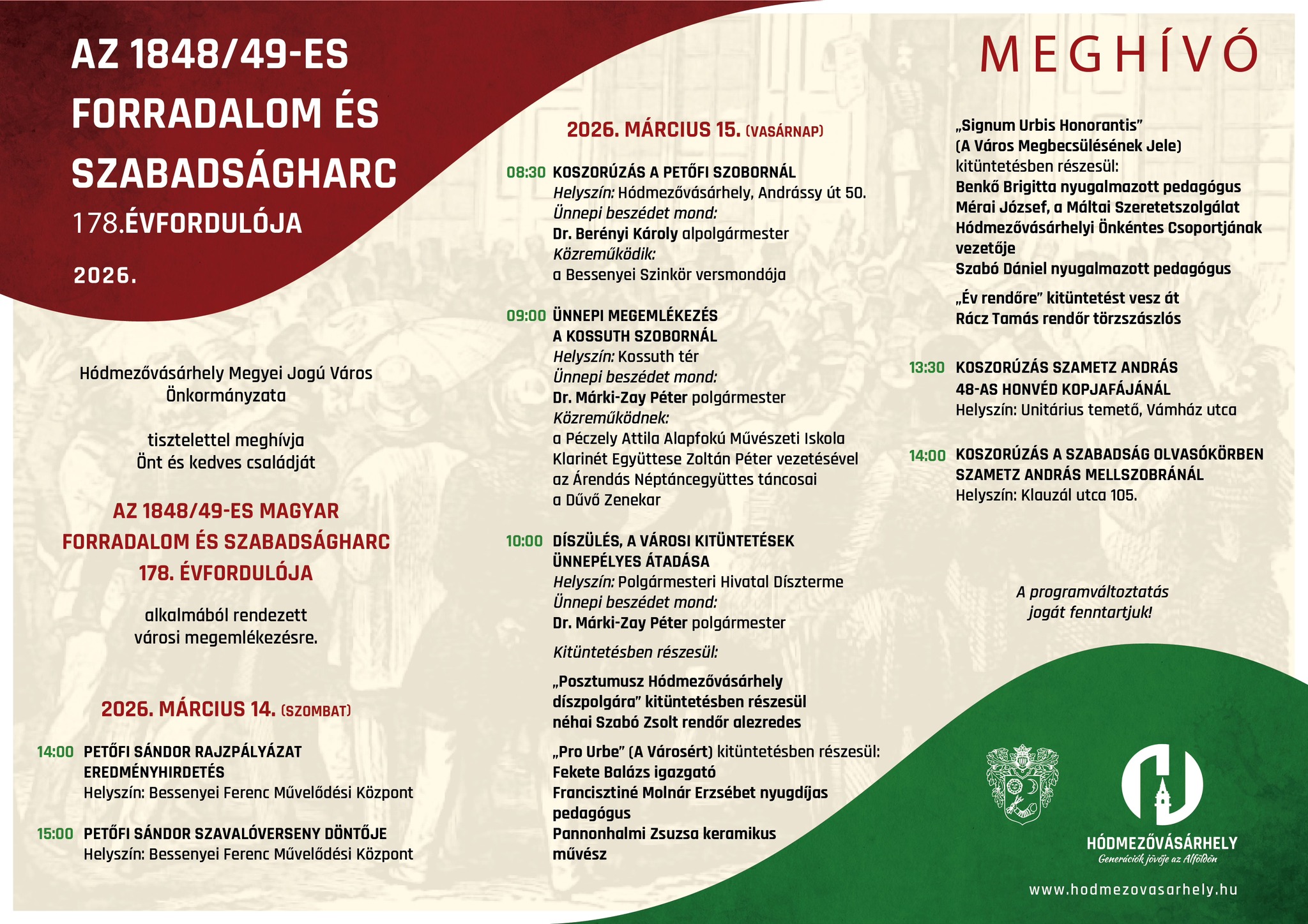 Rajzpályázattal, szavalóversennyel, koszorúzással, városi kitüntetések átadásával emlékeznek az 1848/49-es forradalom és szabadságharc 178. évfordulójára Hódmezővásárhelyen. Mutatjuk a városi megemlékezés részletes programját.