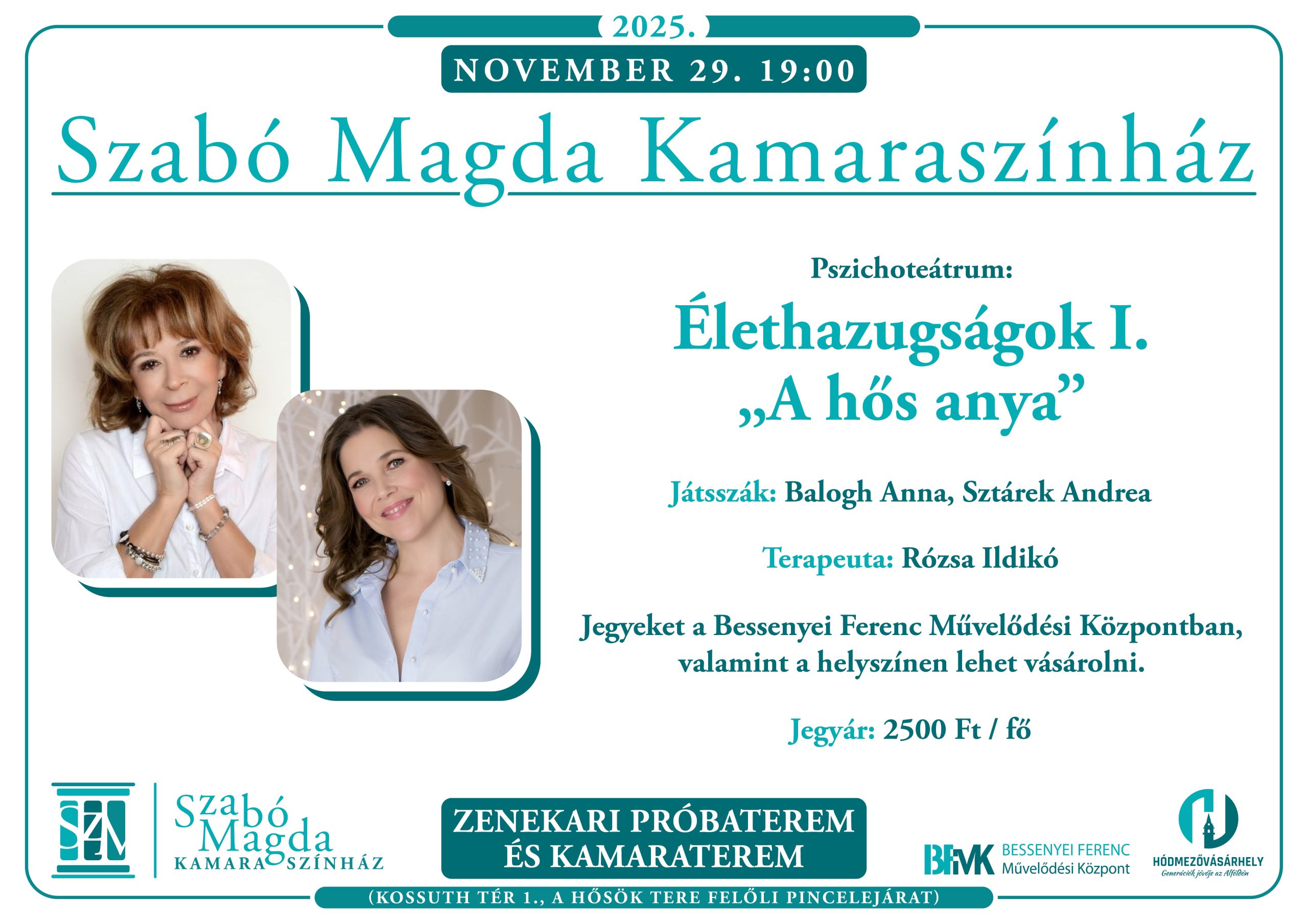 Különleges színházi estére készülhetnek a vásárhelyiek: Balogh Anna és Sztárek Andrea színművészek november 29-én érkeznek Hódmezővásárhelyre, hogy bemutassák az Életigazságok I. – „A hős anya” című előadást. A produkció egy úgynevezett pszichoteátrum, amely mélyen emberi történeteken keresztül mutatja be a hétköznapok érzelmi terheit, a női szerepek összetettségét és a családi kapcsolatok lélektanát. Ebben a művészeket és a közönséget Rózsa Ildikó terapeuta vezeti.