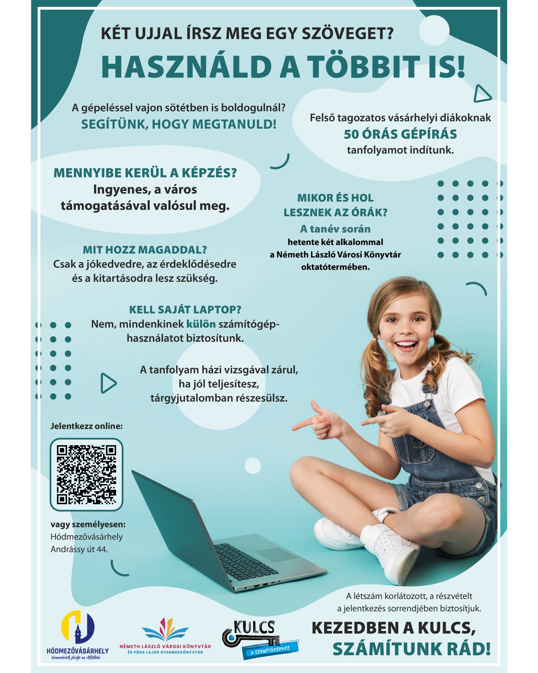 Felső tagozatos vásárhelyi diákoknak 50 órás ingyenes gépírás tanfolyam indul a Németh László Városi Könyvtárban februári kezdéssel, szerdai és szombati napokon a tanév során.