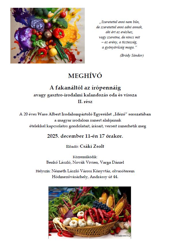 Csáki Zsolt előadásában versek, gondolatok és történetek kelnek életre – mindez december 11-én 17 órakor, a hódmezővásárhelyi Németh László Városi Könyvtár olvasótermében. Közreműködik Benkő László, Novák Vivien és Varga Dániel.
