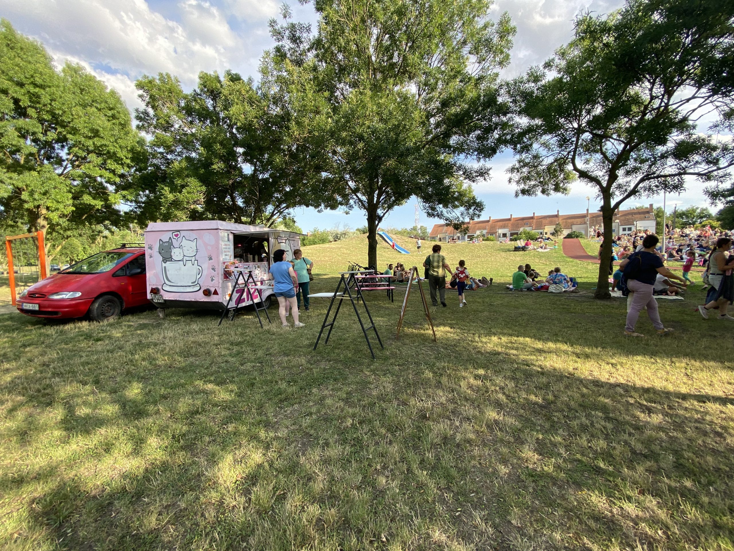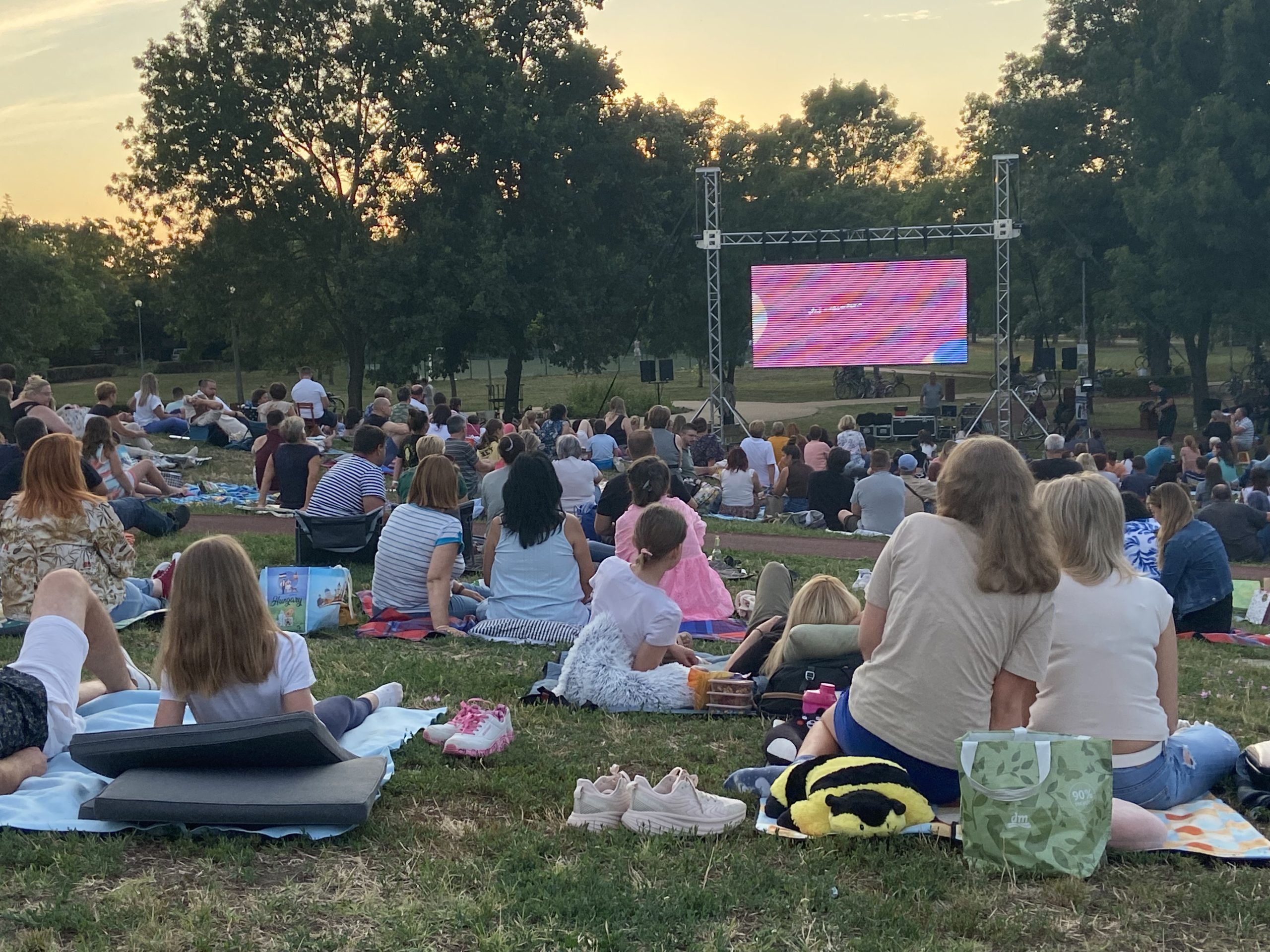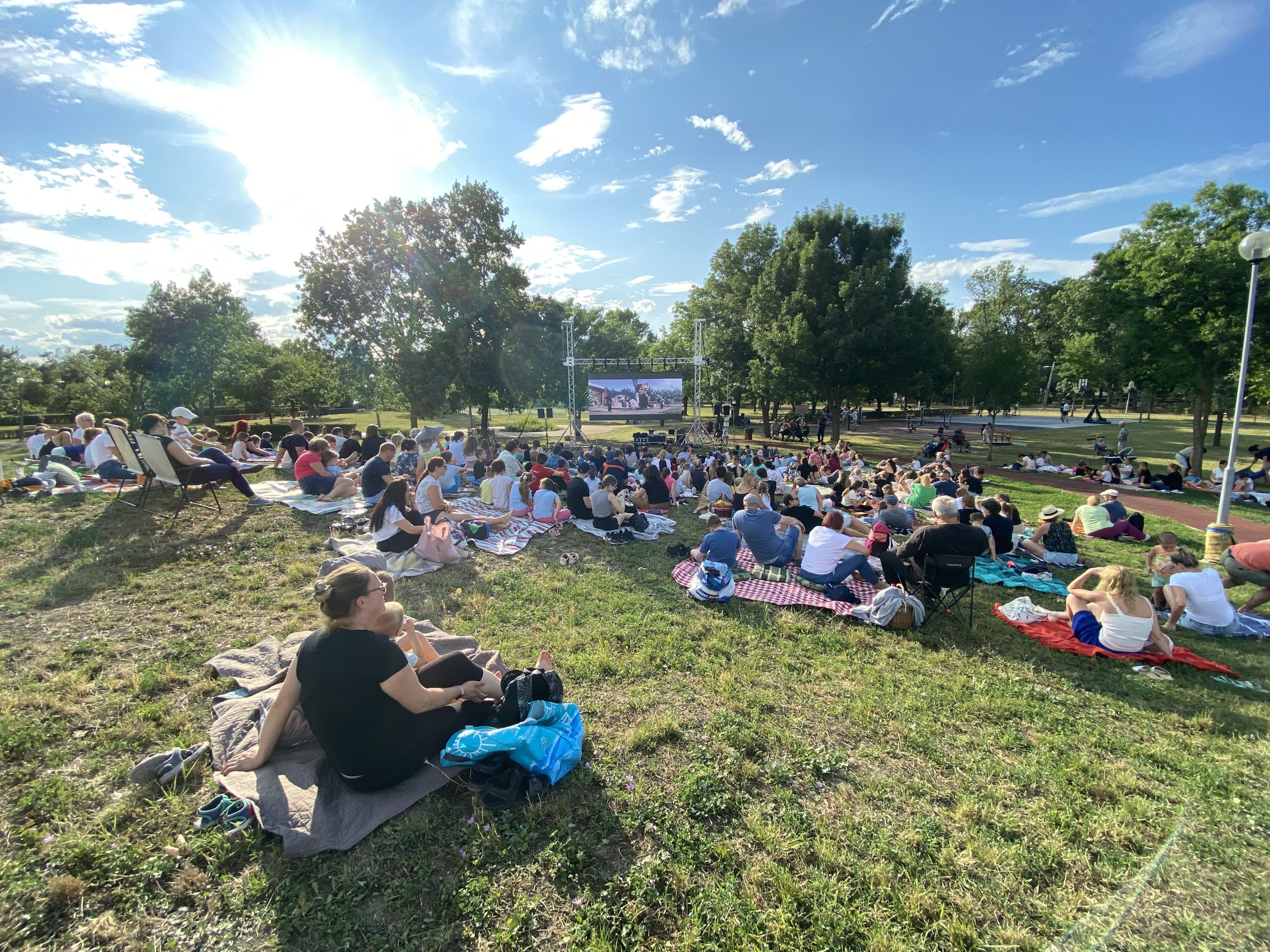 Egyszóval látszott, a körülményekhez alkalmazkodva igyekszik kényelmesen berendezkedni mindenki, saját ízlése szerint, és egy igazi mozival ellentétben itt nem a popcorn meg a nacho ropogása töltötte meg a teret. Ahány csoport és család, annyiféle különböző „nasival” érkeztek, amit azért teszek itt idézőjelbe, mert többen egyenesen a vacsorájukat helyezték ki erre a helyszínre – volt aki szendvicset hozott, volt, aki pizzát rendelt ide, másnak pedig még kecses borospohár és eperbor is kikandikált a piknikkosarából. A színtér pedig, mondhatni, tökéletesen gyerekbarát, hiszen az izgő-mozgó csemeték bármikor felkelhetnek helyükről, lecsúszhatnak a csúszdán, vagy kipróbálhatják a néhány méterrel arrébb lévő kondieszközöket -mindezt úgy, hogy senkit sem zavarnak közben.