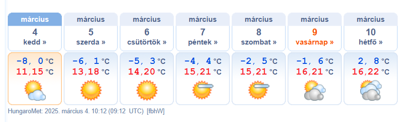 Bár a hajnalok, és a reggelek ezen a héten még fagyosak lesznek, napközben rendre felmelegszik majd a levegő, igazi tavaszi időben lesz részünk. Kedden érezhetően enyhe lesz a délután, 10-15 fokos maximumokat mérhetünk. Szerdán is marad a napos, száraz idő, csütörtökre pedig tovább melegszik az idő, délután elérhetjük a 20 fokot is.