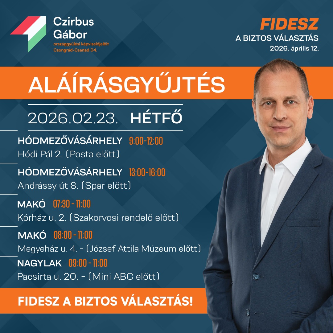 Hódmezővásárhelyen, Makón és Nagylakon is lesz lehetőség egy aláírással támogatni a Fidesz jelöltjét. Hétfőn délelőtt például a Hódi Pál utcai nagyposta előtt, délután a kis Spar előtt gyűjtenek.