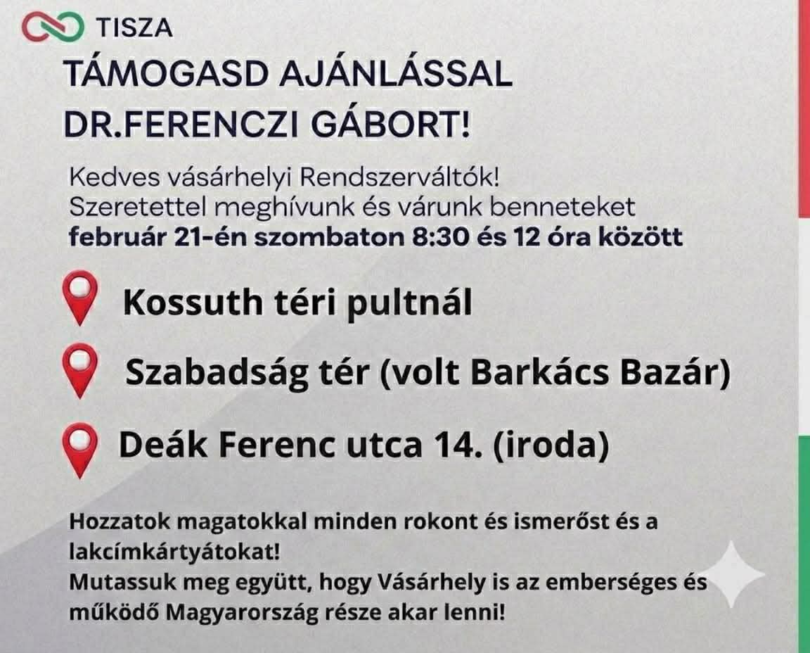 Ahhoz, hogy valaki hivatalosan képviselőjelölt lehessen, 500 érvényes ajánlást kell gyűjtenie a választókörzetből, ahol indulni szeretne. Az ajánlóíveket szombat reggel lehet felvenni, ettől fogva 30 napjuk van a jelölt-jelölteknek, hogy összeszedjék a kellő számú ajánlást. A Tisza Csongrád-Csanád 4-es körzetében induló jelöltjének, Ferenczi Gábornak szombaton három helyen is alá lehet írni Hódmezővásárhelyen, szombaton 8:30 és 12 óra között: