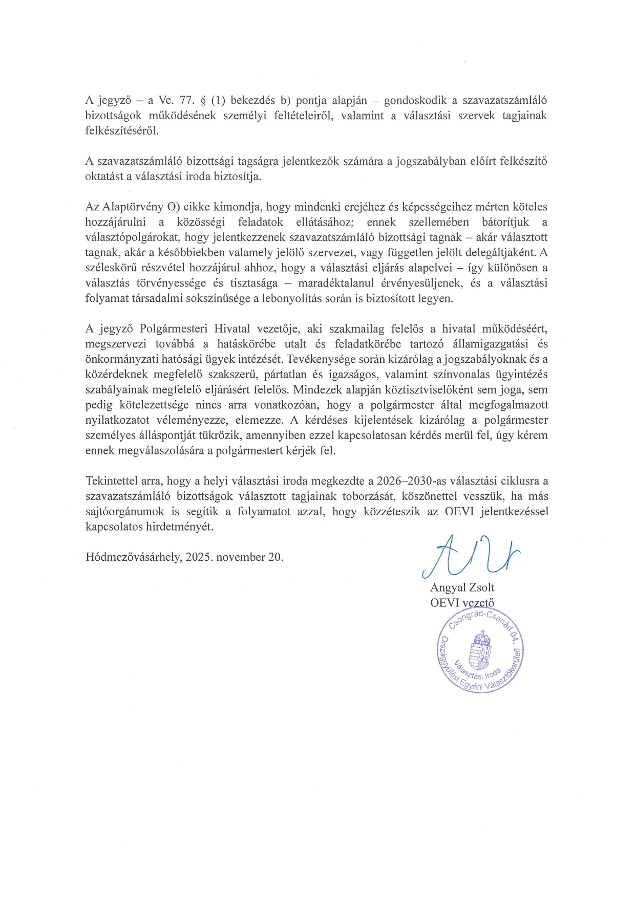 Közleményt adott ki Angyal Zsolt jegyző a jövő év áprilisi választásokra való szavazatszámláló-bizottségi tagok jelentkezése kapcsán. Nem az első alkalom, hogy egy a Promenád24-en megjelent (szerző nélküli) írásra kell ilyen módon reagálnia a jegyzőnek.