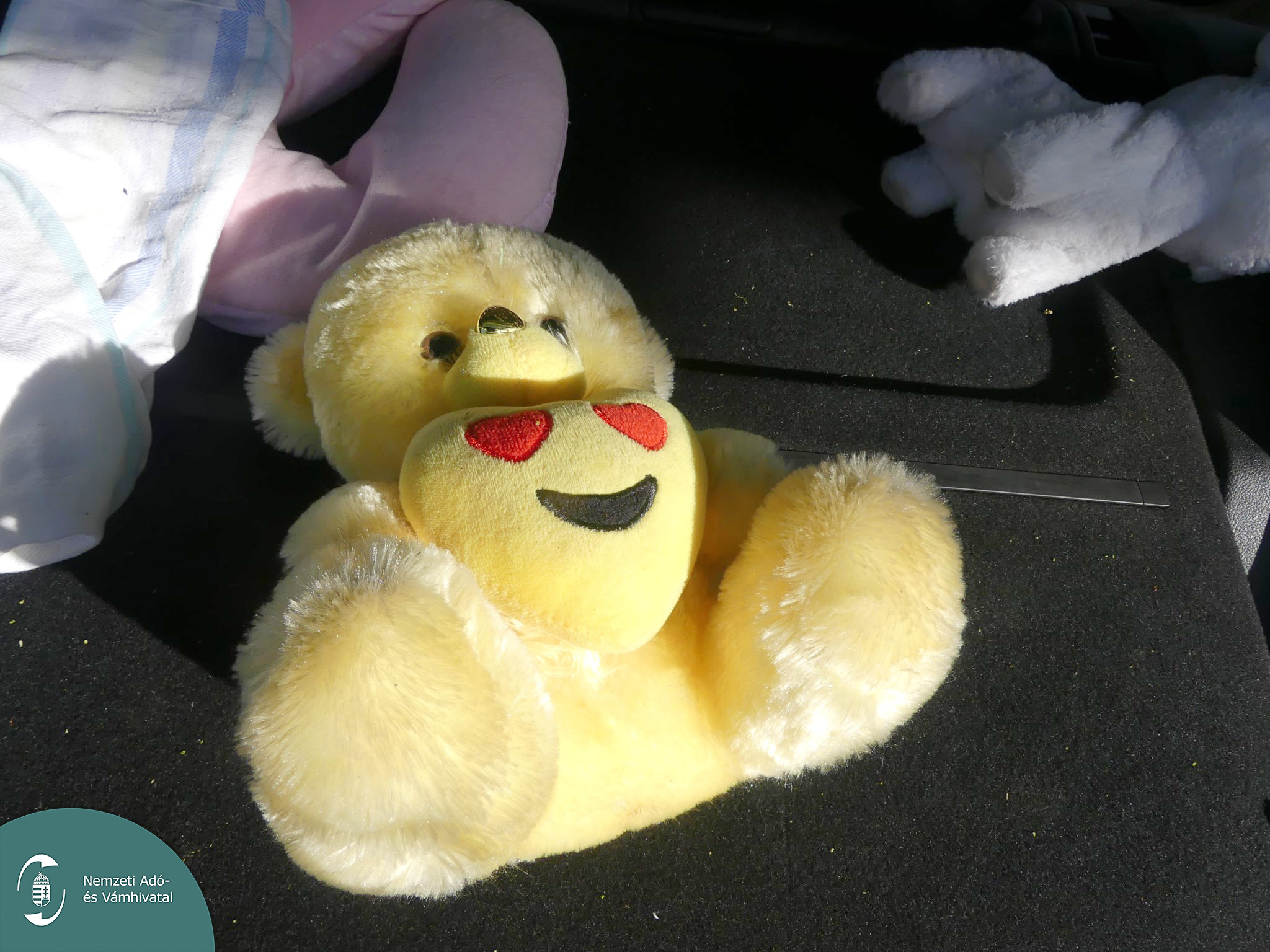 A sofőr ugyan tagadta, hogy bejelentésköteles árut szállítana, azonban a pénzügyőrök a jármű átvizsgálásakor – különböző csomagolásban – nagy mennyiségű textilárut találtak. A tételes átvizsgálás során szúrt szemet a kalaptartón lévő mackó. A plüss belsejét nemcsak puha béléssel tömték ki, hanem kábítószergyanús anyaggal is megtöltötték. A növényszármazék tesztelése megerősítette, hogy a játékfigurába kannabisz-származékot rejtettek el. A gépjármű vezetője azt állította, hogy nem tudott az összesen 4,3 grammos csomagról.