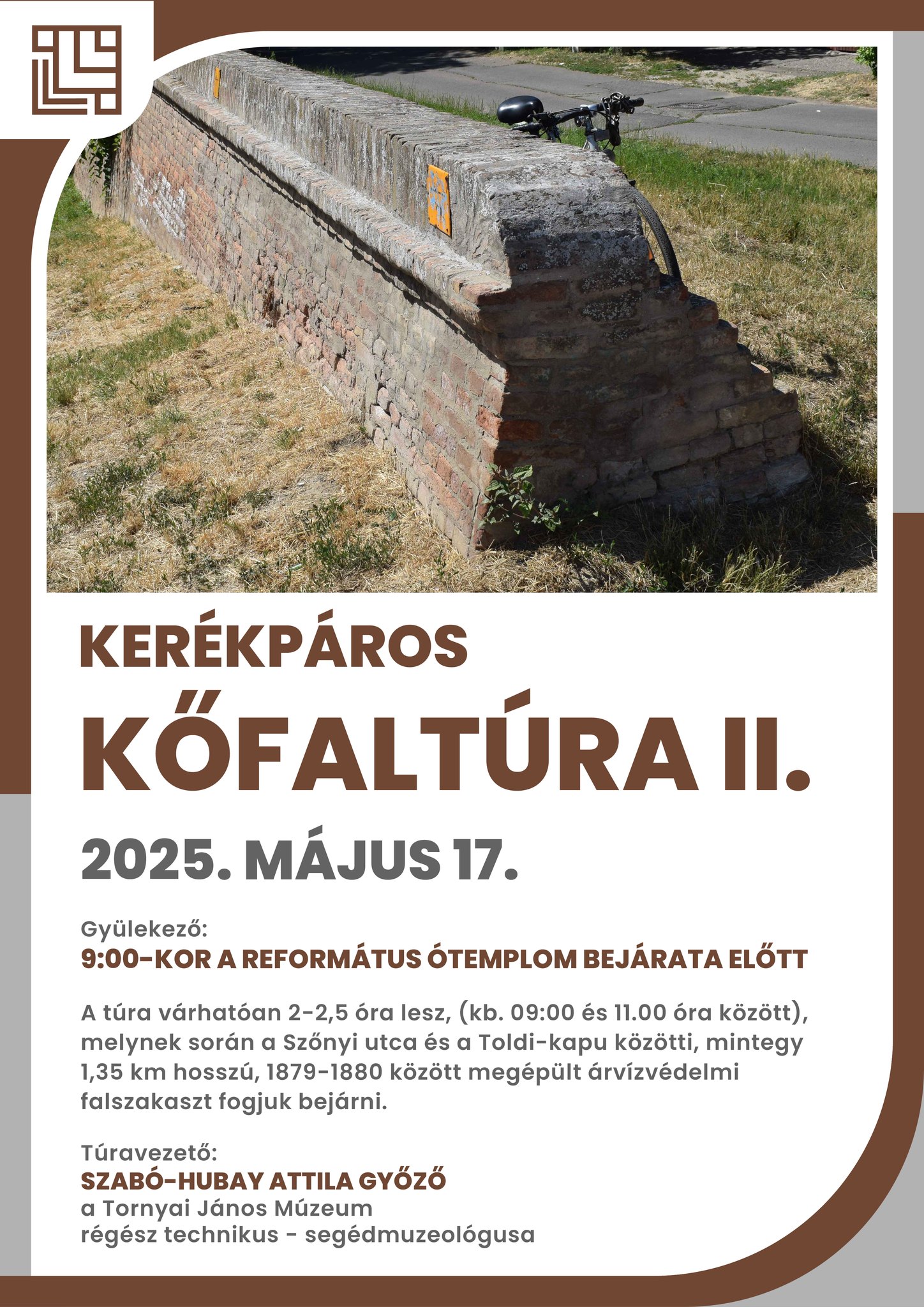A Tornyai János Múzeum minden érdeklődőt szeretettel vár 2025. május 17-én, szombat délelőtt a múzeum kerékpáros helytörténeti túrájára. A találkozó a Református Ótemplom bejárata előtt lesz 9 órakor és a túra várhatóan 11 óráig fog tartani.