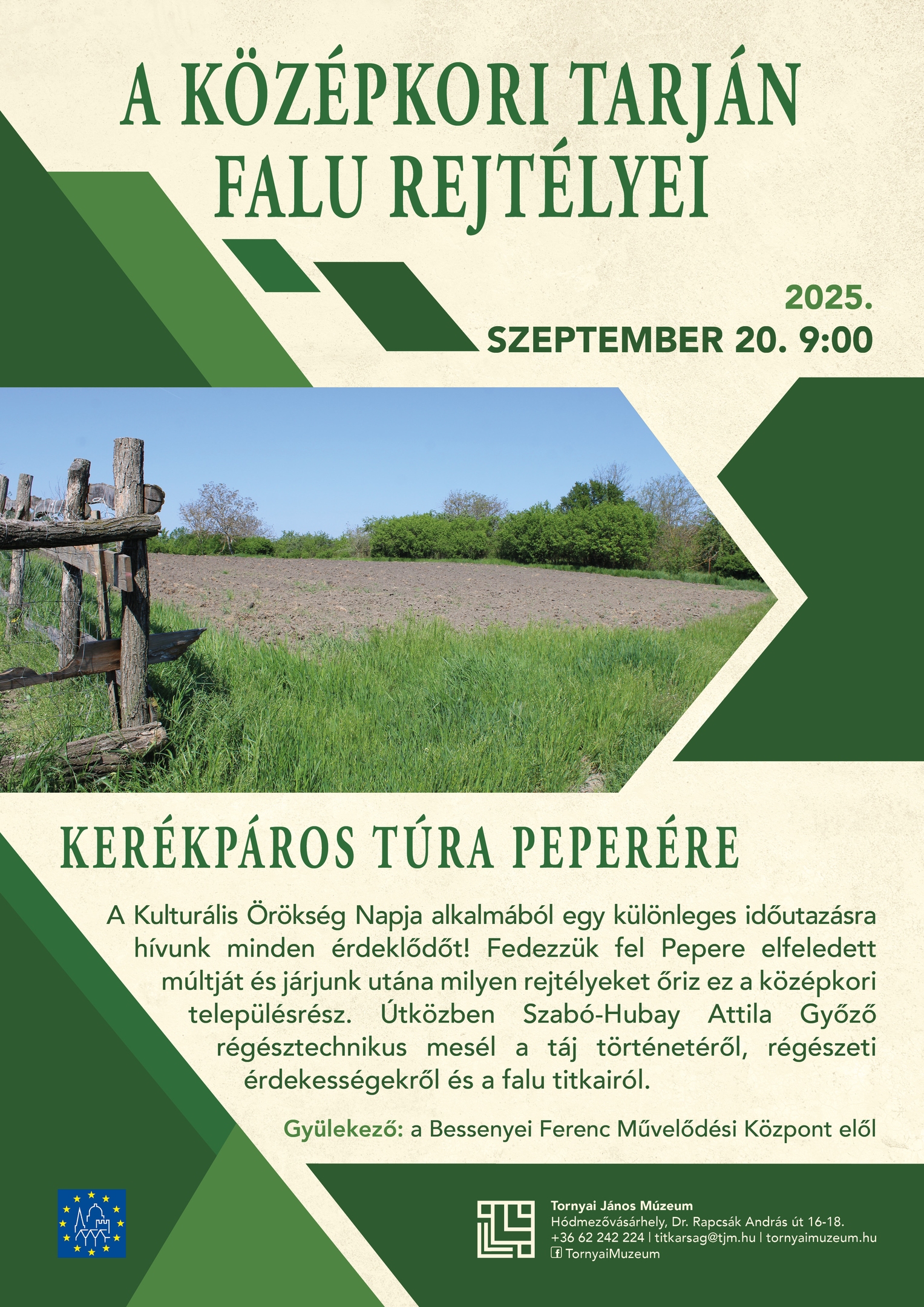 A Kulturális Örökség Napjai programsorozathoz kapcsolódó hétvégi felfedezőúton Hódmezővásárhely egy ősi településrészének, a középkori Tarján falunak a történetével ismerkedhetnek meg a helyszínen a résztvevők. A „terepbejáráson” régészeti és fémdetektoros bemutatóval is készülnek a múzeum szakemberei – tájékoztatta a Vásárhelyi Médiacentrumot a Tornyai János Múzeum.