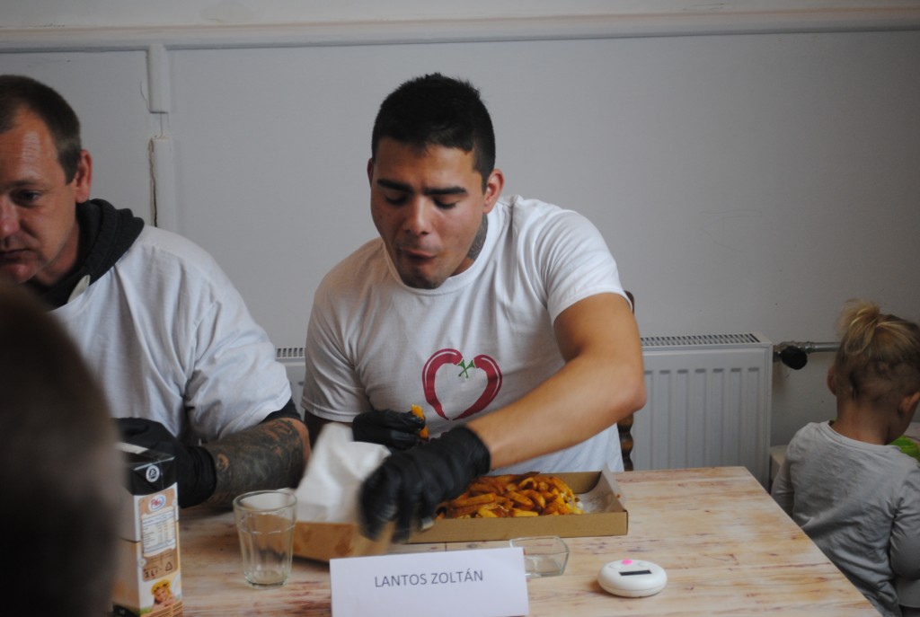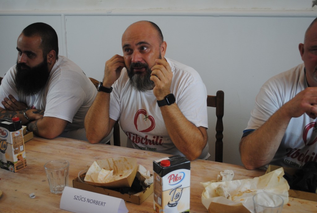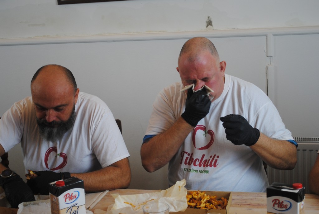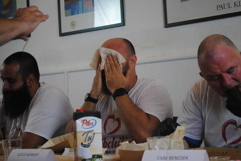 A tíz versenyzőt így is két csapatban, azaz ötösével lehetett a hosszú asztalhoz ültetni, hogy azok a lelkes szurkolók ámulatára alaposan nekilássanak a feladat megoldásának, azaz a rendkívül csípős étel mielőbbi elfogyasztásának.