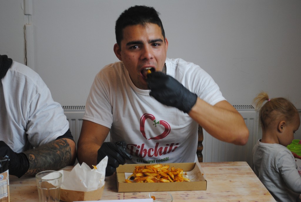 Küzdöttek is derekasan az első, majd a második csoport versenyzői, akik az evés második percében már nem mosolyogtak annyira, a harmadikban volt, aki homlokáról folyni kezdett a verejték, akadt, aki csuklani vagy vörösödni kezdett. S bár a menüt kesztyűs kézzel fogták meg, mégis akadt, akinek a könnye is kicsordult. És ketten fel is adták a versenyt, igaz, csak a kemény első három perc után. A versenyzőknek egyébként a tűzforró sültkrumpli is feladta a leckét.