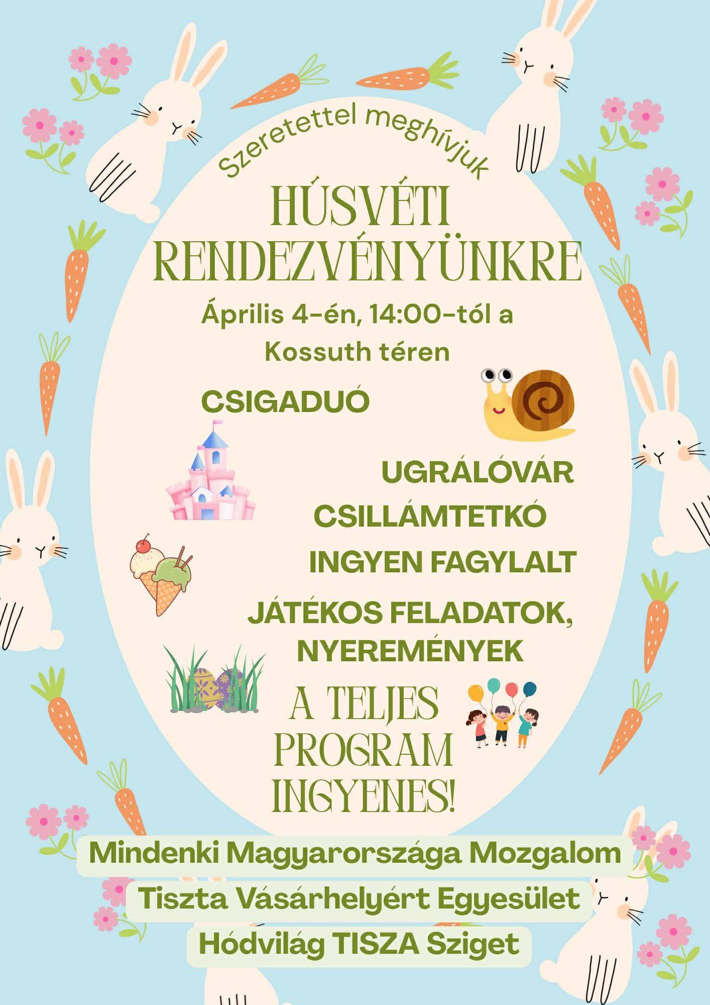 A másik program délután 2 órakor, a Mindenki Magyarországa Mozgalom, a Tiszta Vásárhelyért Egyesület és a Hódvilág Tisza Sziget szervezésében a Kossuth téren kezdődik. Ezen fellép a Csiga dutó, lesz ugrálóvár és arcfestés és ingyen fagylalt.