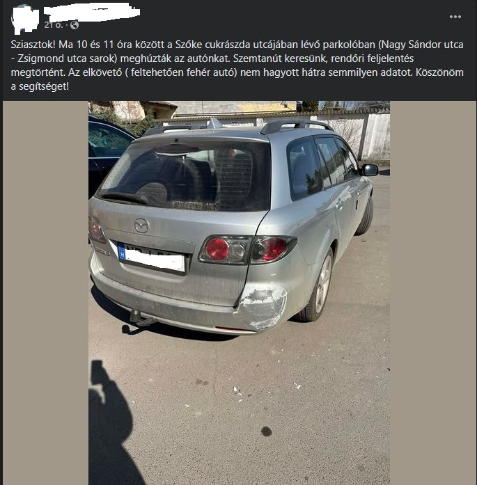 „Sziasztok! Ma 10 és 11 óra között a Szőke cukrászda utcájában lévő parkolóban (Nagy Sándor utca – Zsigmond utca sarok) meghúzták az autónkat. Szemtanút keresünk, rendőri feljelentés megtörtént. Az elkövető (feltehetően fehér autó) nem hagyott hátra semmilyen adatot. Köszönöm a segítséget!” – írta egy autós a majdnem 21 ezer követővel rendelkező Hmvhely Carlife oldalon.