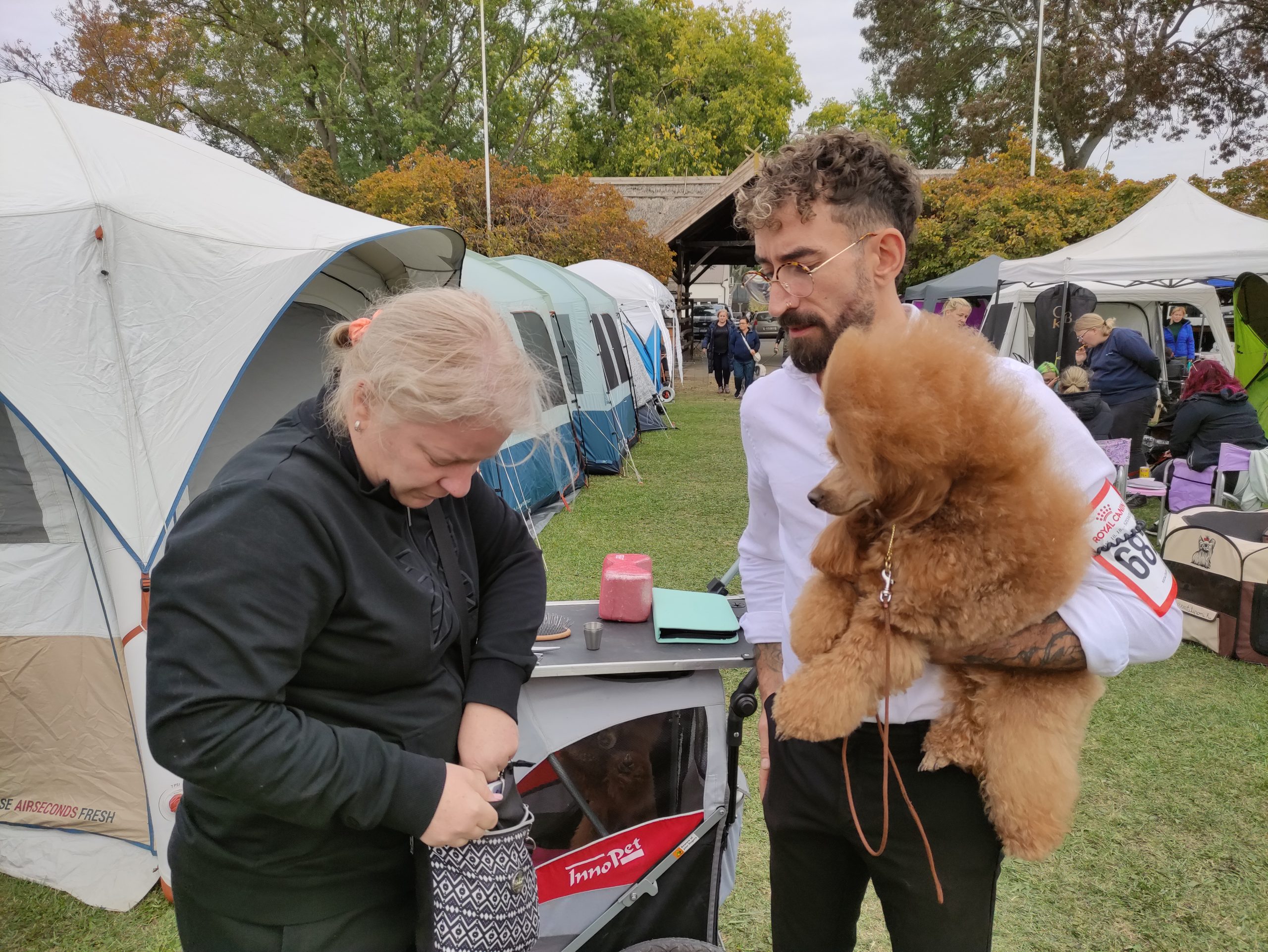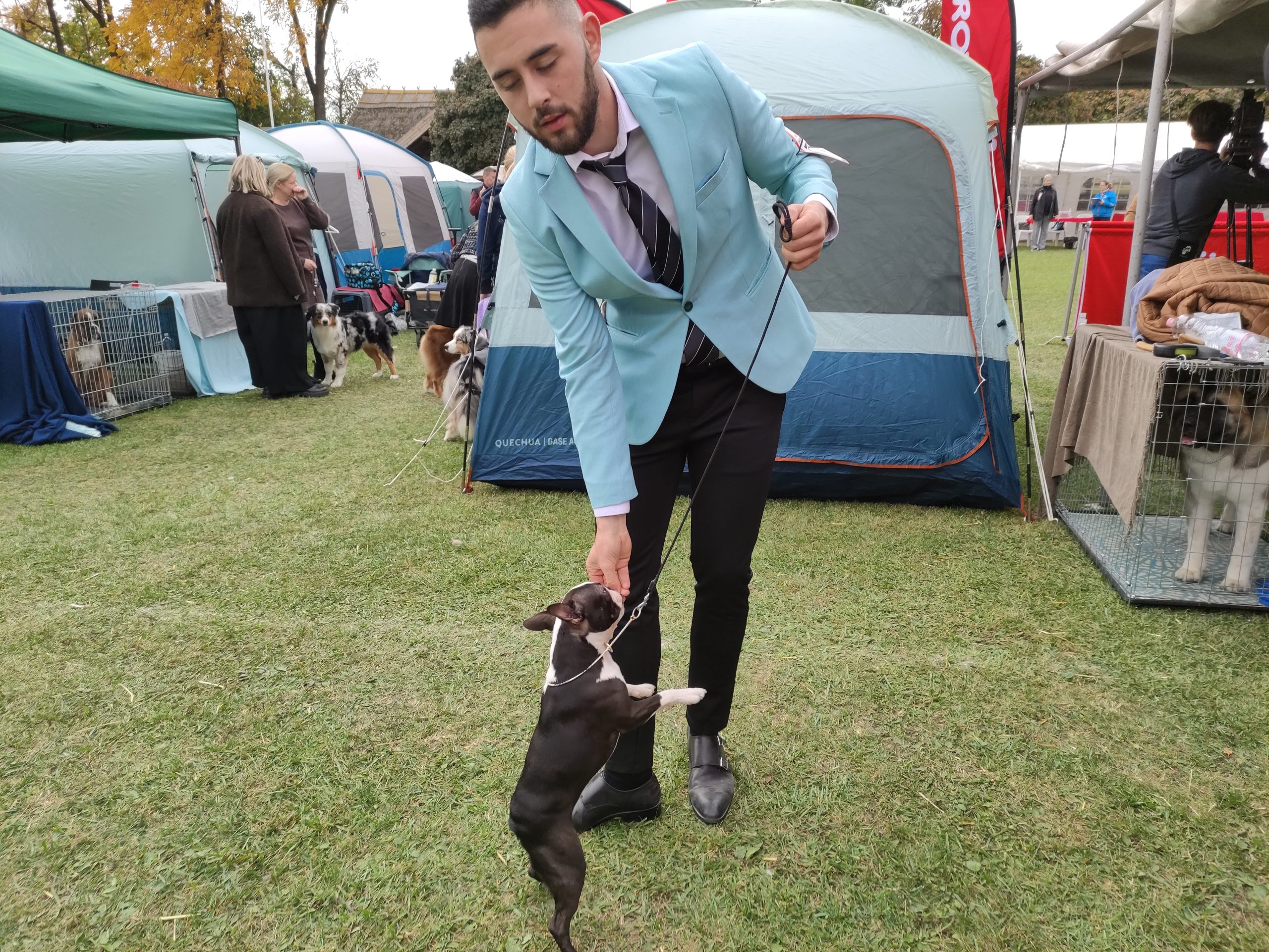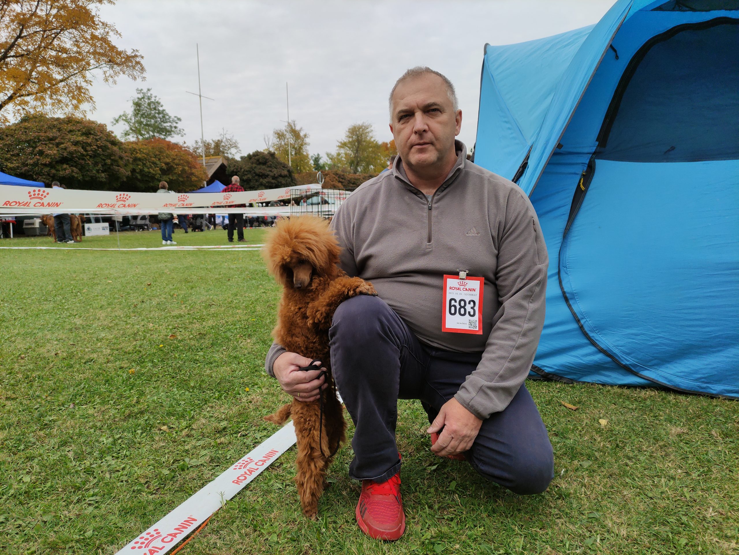 – Húsz hónapos, de ez már a sokadik versenye. A kiállítások előtt legalább kétszer megfürdetjük, másodjára közvetlenül a kiállítás előtti napon. A szőrét is megnyírjuk – hiszen ez nyírós fajta –, és kozmetikázzuk is. Itt, a kiállításon folytatódik a készülődés: fellakkozzuk és begumizzuk a „haját”, ahogy a hölgyeknek szokás, pedig ő fiú. Az uszkárok nagyon okosak, intelligensek és családbarátok, szeretik a gyerekeket, ezért is annyira népszerű fajta – mondta gazdája.