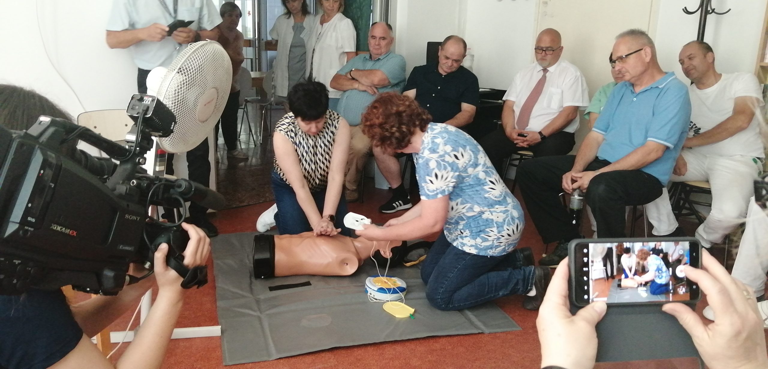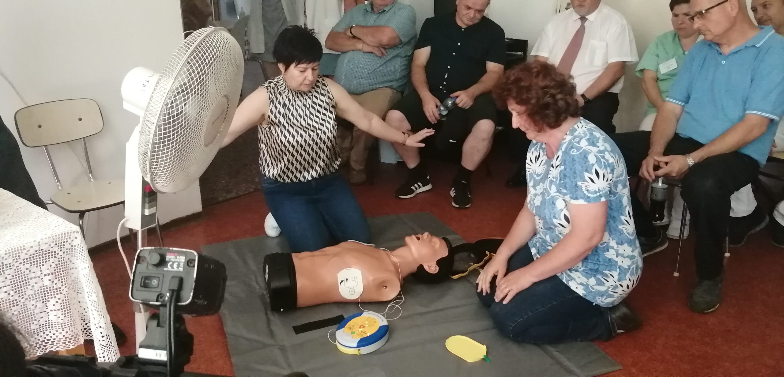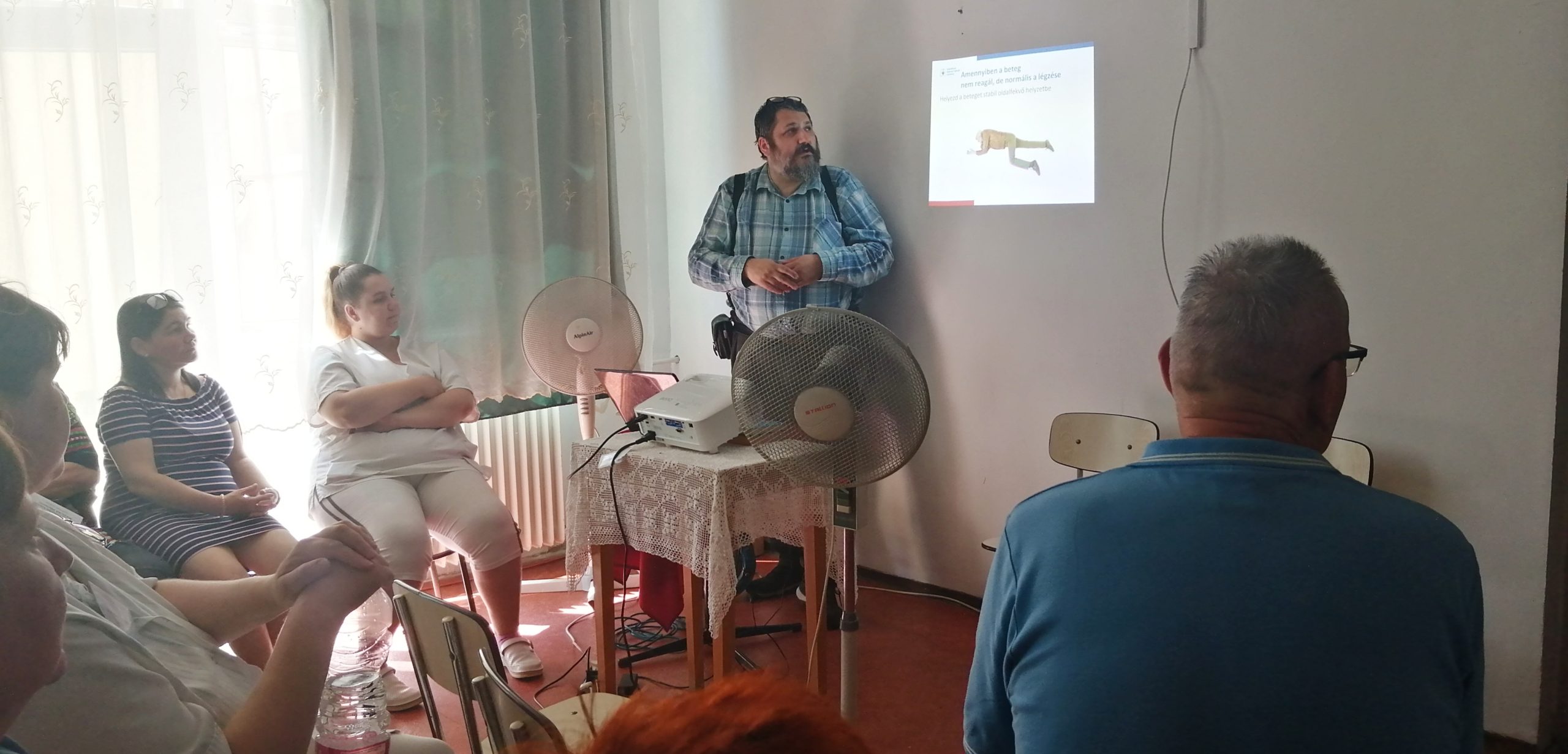 A pályázatnak – amelyet a budapesti Szent Ferenc Kórház indított – része egy továbbképzés is, amelyet a békéscsabai kórházból ideérkező három szakember tartott a Kovács-Küry Időskorúak Otthona ápoló személyzetének, valamint a hivatal és az önkormányzati cégek önként jelentkező alkalmazottainak. Ennek keretében csütörtök délelőtt alapszintű újraélesztést oktattak a résztvevőknek.