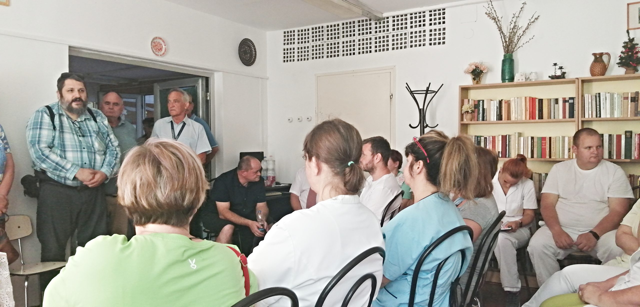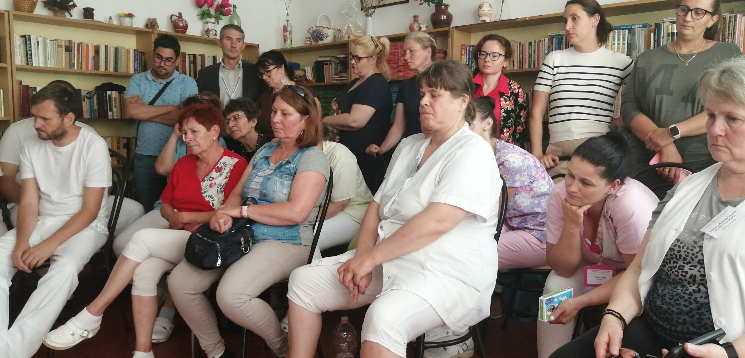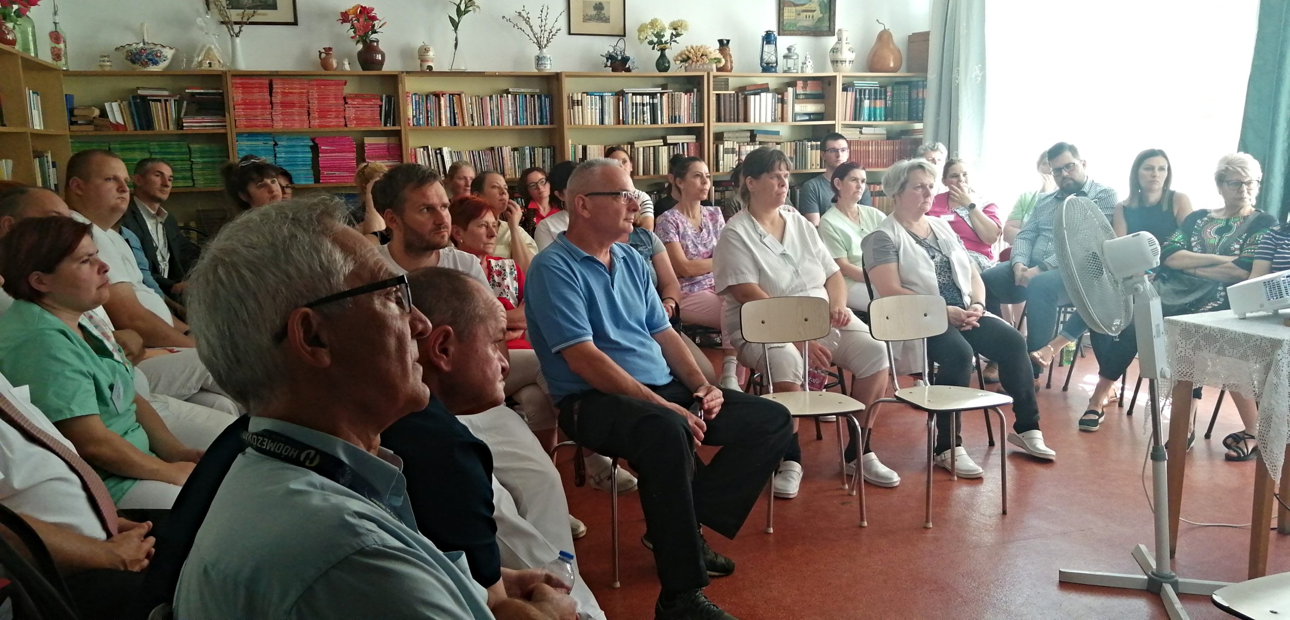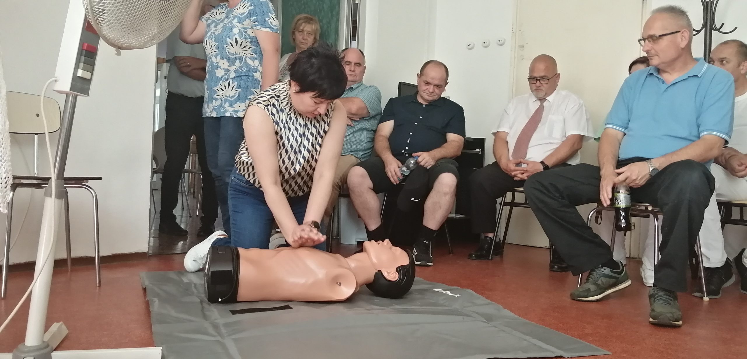 A pályázatnak – amelyet a budapesti Szent Ferenc Kórház indított – része egy továbbképzés is, amelyet a békéscsabai kórházból ideérkező három szakember tartott a Kovács-Küry Időskorúak Otthona ápoló személyzetének, valamint a hivatal és az önkormányzati cégek önként jelentkező alkalmazottainak. Ennek keretében csütörtök délelőtt alapszintű újraélesztést oktattak a résztvevőknek.
