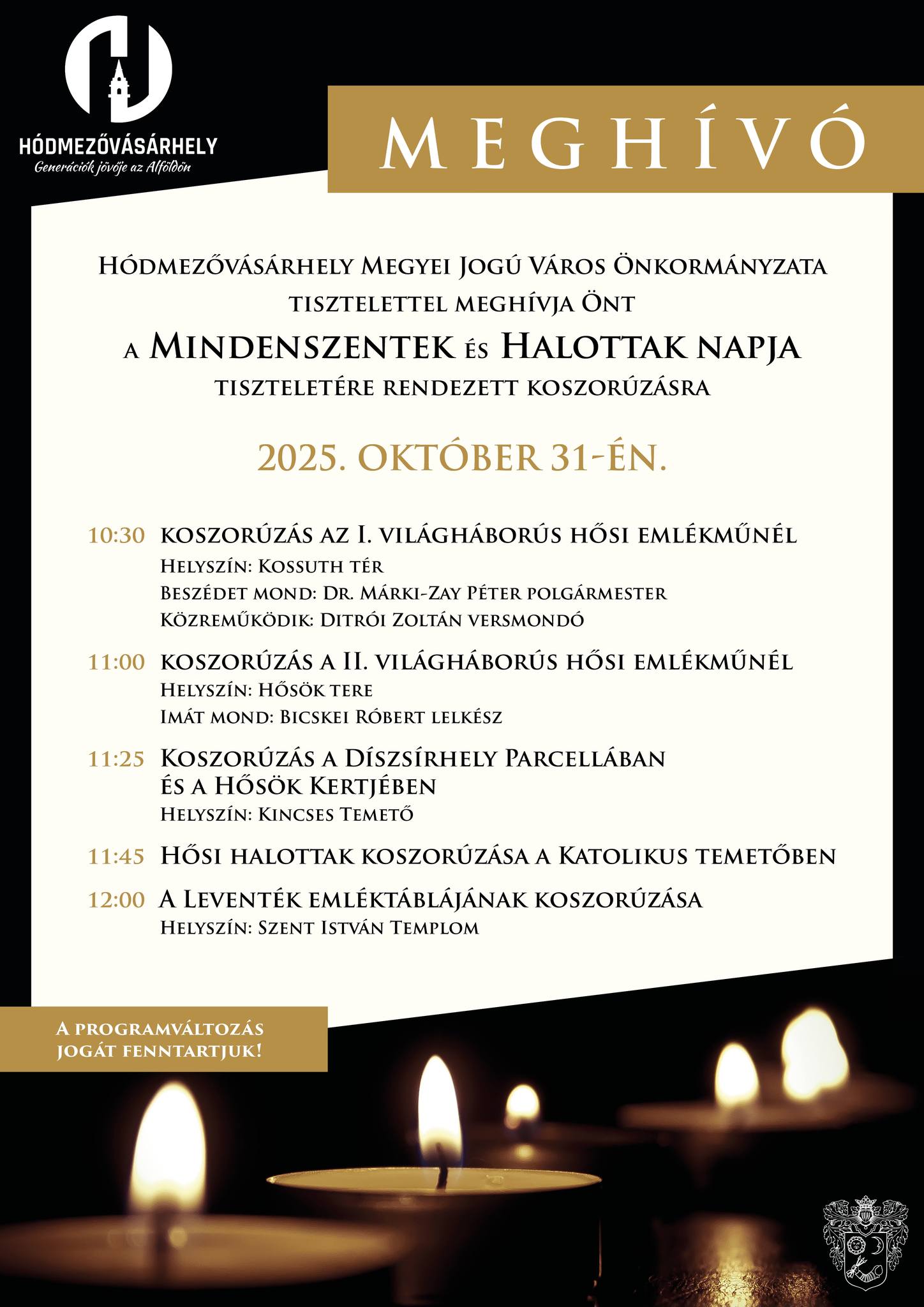 Hódmezővásárhely Megyei Jogú Város Önkormányzata idén is közös megemlékezésre hívja a vásárhelyieket Mindenszentek és Halottak Napja alkalmából.