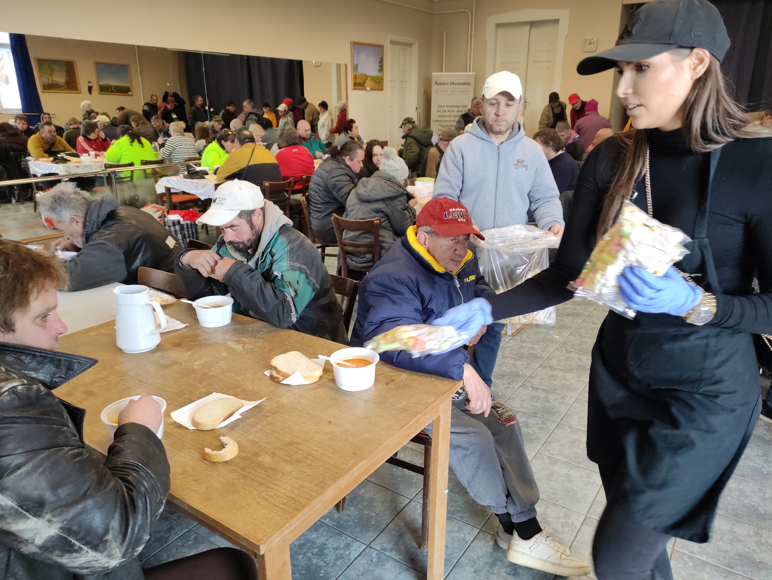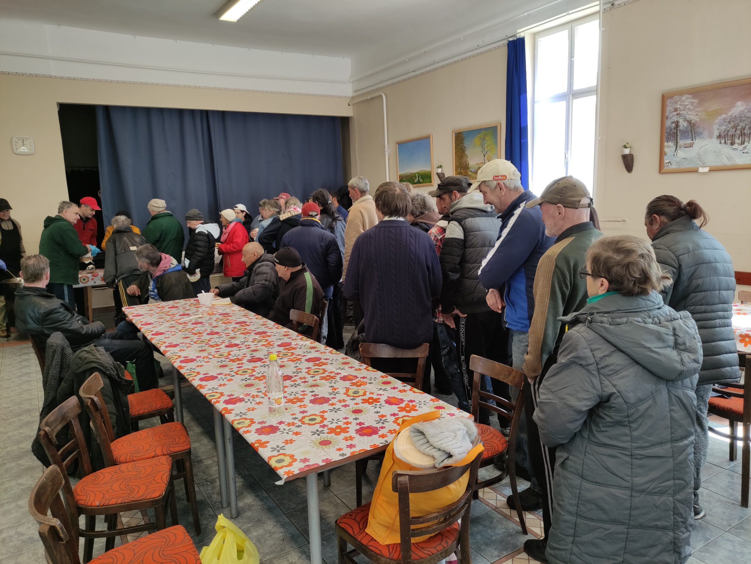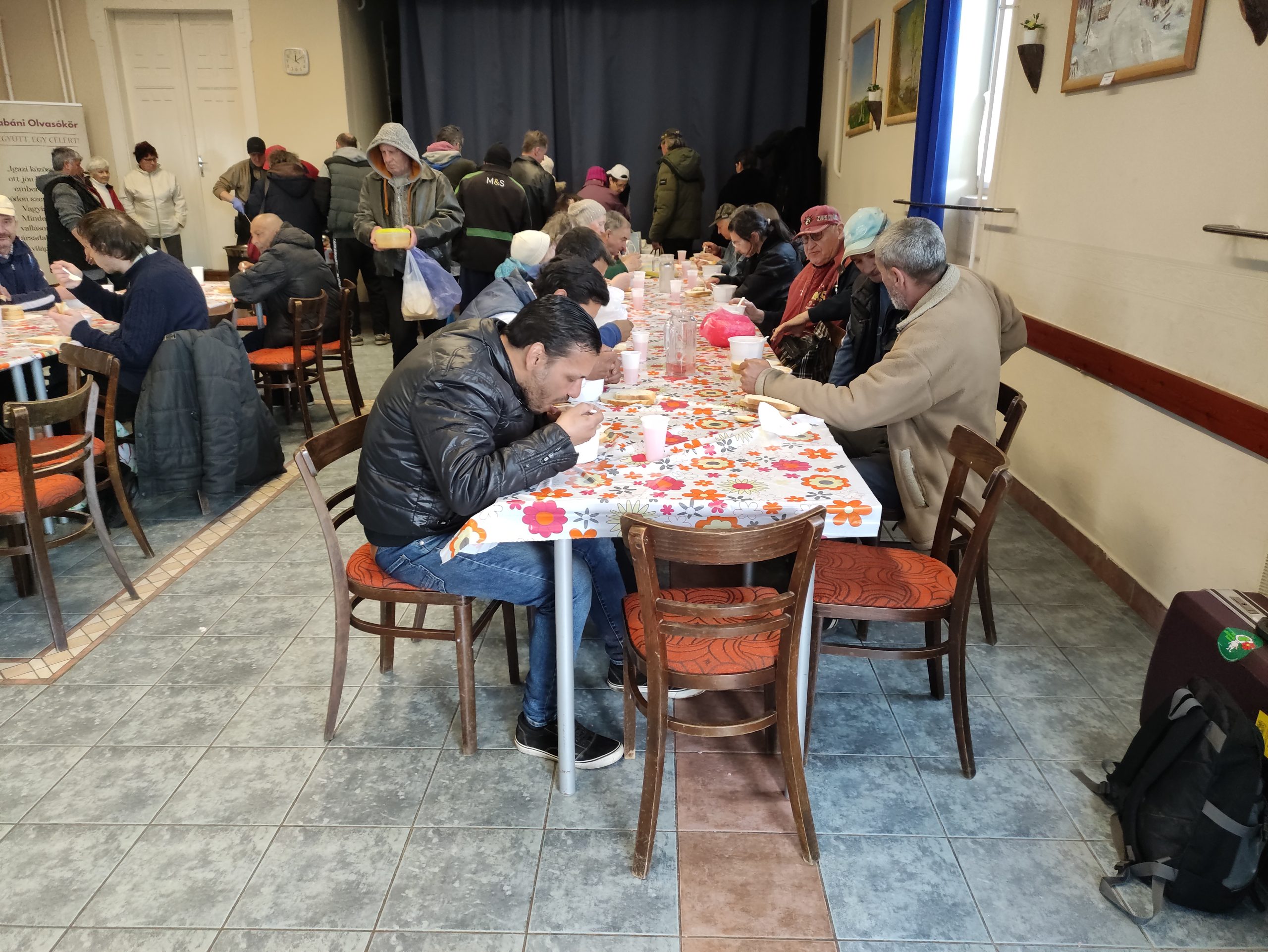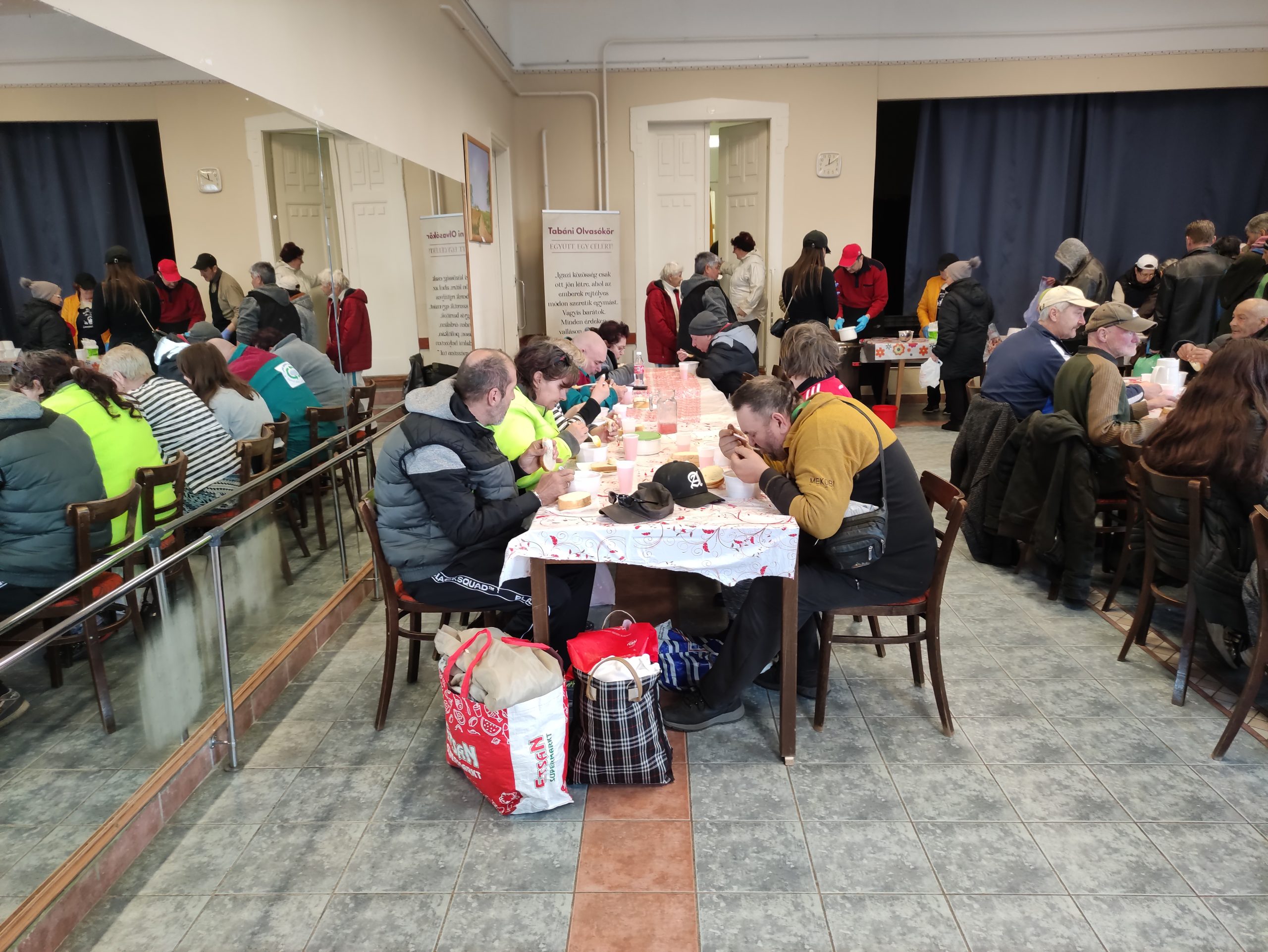 Nem kellett nagyon biztatni a Mindenki Magyarországa Mozgalom, a Minden Fiatal Magyarországa és a Tiszta Vásárhelyért Egyesület vasárnap déli, a Tabáni Olvasókör Szerencse utcai székházában rendezett ingyenes ételosztáson megjelenteket. A valamivel több, mint hatvan érdeklődő szépen sorban állt a Czeller Éva önkéntes által fűzött csurgatott tojásos, füstölt húsos krumplilevesért, majd amikor azt megkapták szépen leültek s elkanalazták a sűrű és forró egytál ételt.