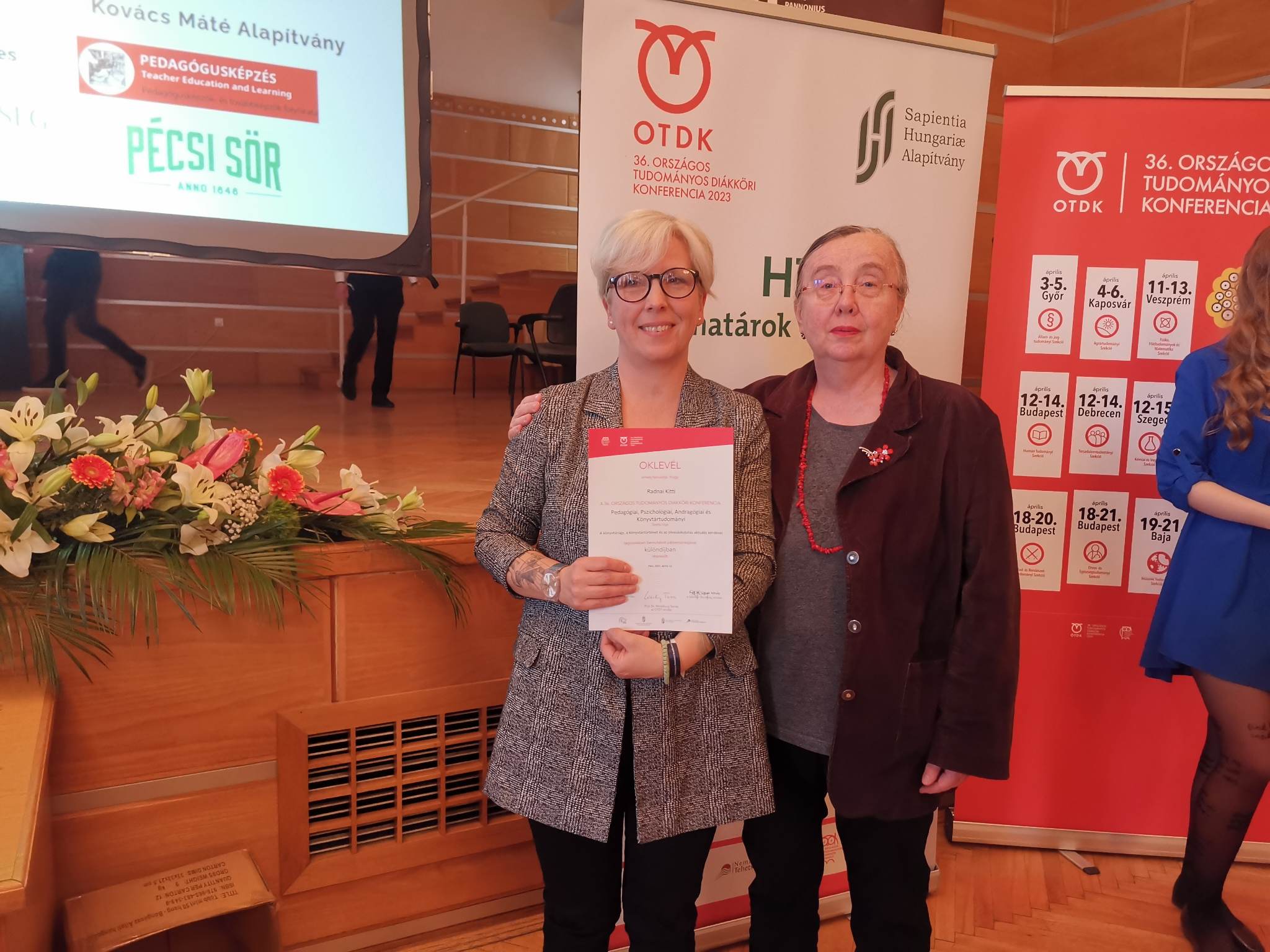 Szakkönyvtáros kolléganőjük, Radnai Kitti a pécsi, április 11-13. között megrendezett 36. Országos Tudományos Diákköri Konferencián a Könyvtártudomány, a könyvtárügy, a könyvtártörténet és az olvasáskutatás aktuális kérdései alszekcióban, a Wiener Tibor könyvei avagy egy műgyűjtő lelkész hagyatéka című előadásával különdíjat és szponzori különdíjat nyert.