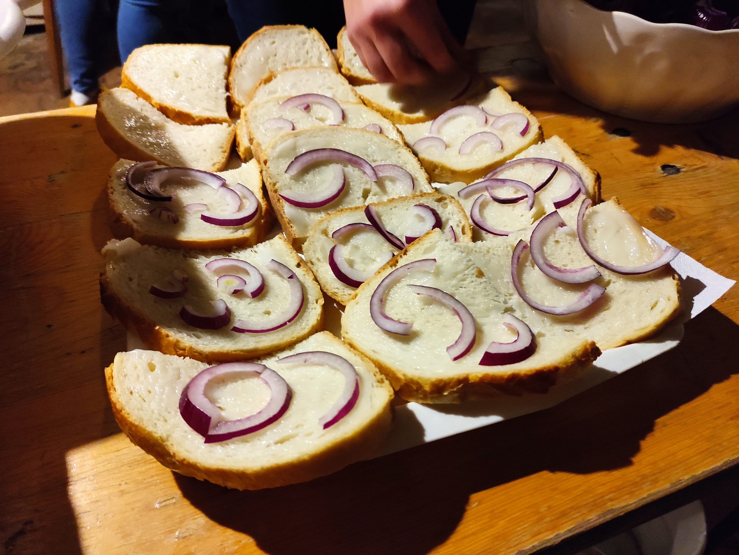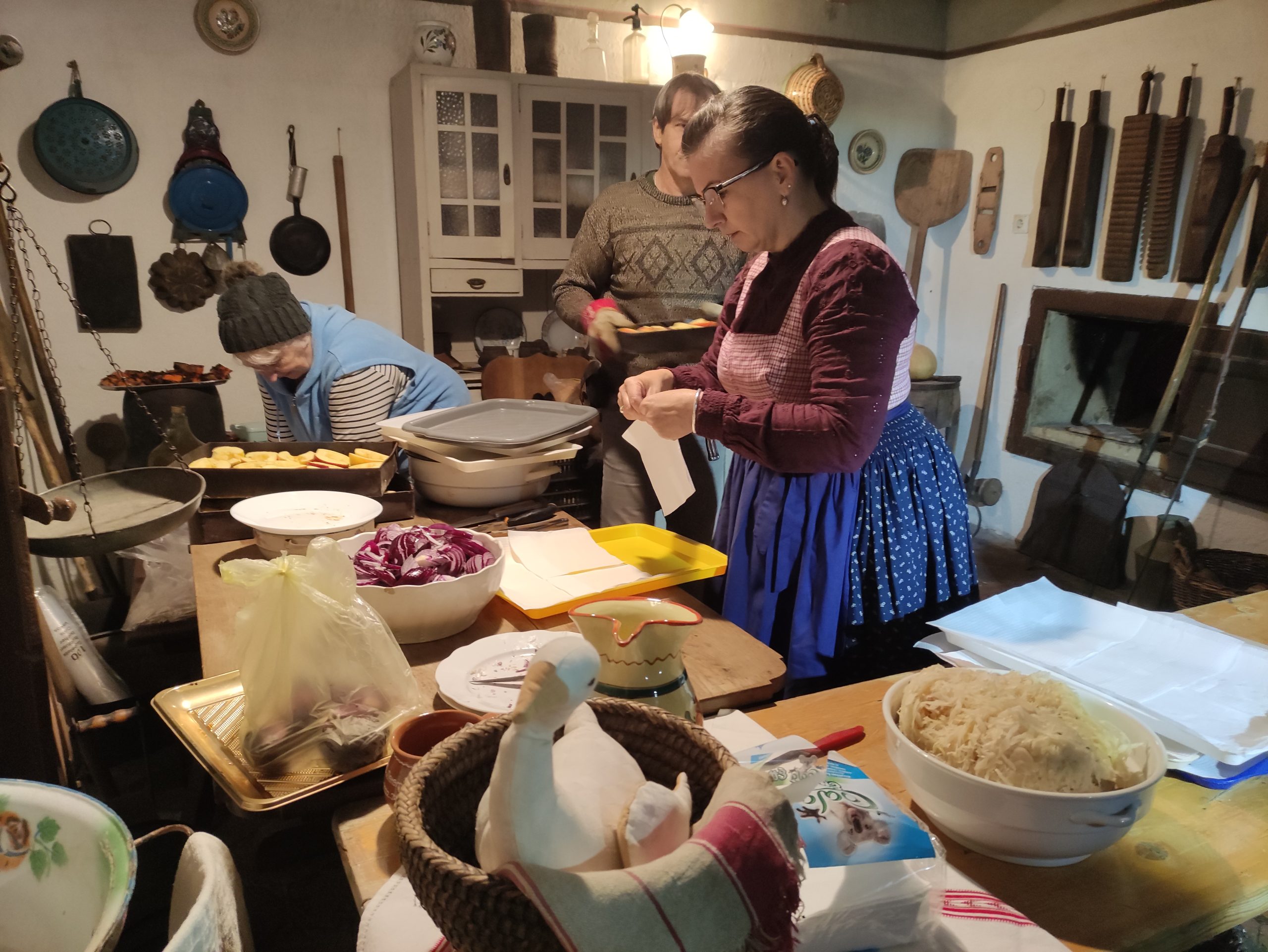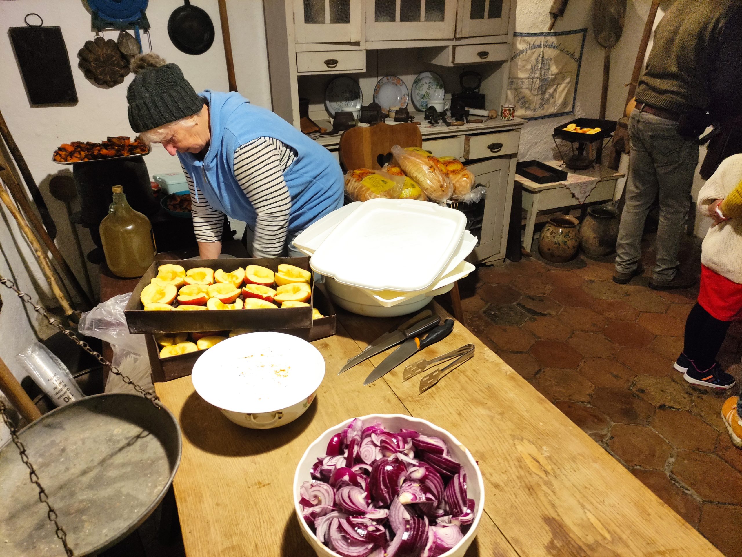 Az Árpád utcai tájház kemencéjében szombaton délelőtt almát és tököt is sütöttek, de a konyhában libazsíros, lila hagymás kenyeret is kentek.