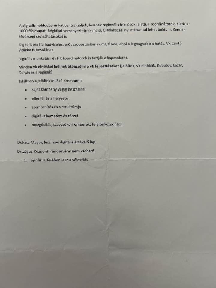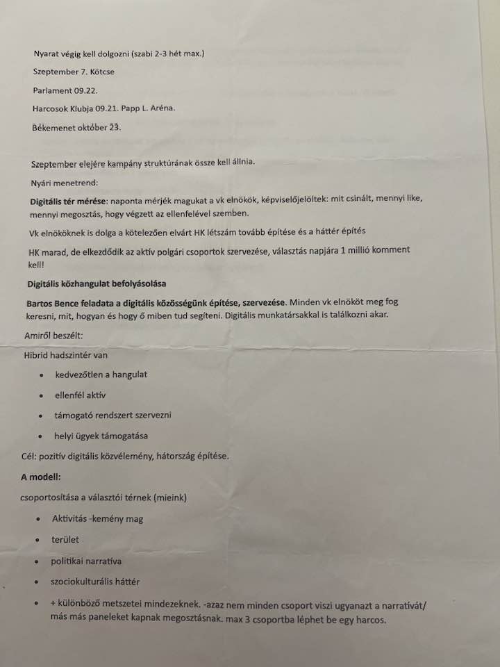 Az írás eleve azzal a megjegyzéssel kezdődik: „a nyarat végig kell dolgozni”. Ha a dokumentum valódi, akkor egyértelmű, hogy a rogáni gépezet a „digitális térre” helyezi a hangsúlyt a 26-os kampány során. Kiderül belőle, hogy a választókerületi elnököknek kötelessége lesz a Harcosok Klubja nevű kommenthadsereg ügyeinek intézése. A papír szerint a Fidesz „digitális közösségének” építése egy Bartos Bence nevű ember feladata lesz, és fontos szerepet kap Dukász Magor, a Digitális Szuverenitás Központ vezetője. Az is kiderül, hogy a várttal ellentétben nem április 12-én, hanem a hónap második felében lesz a választás.