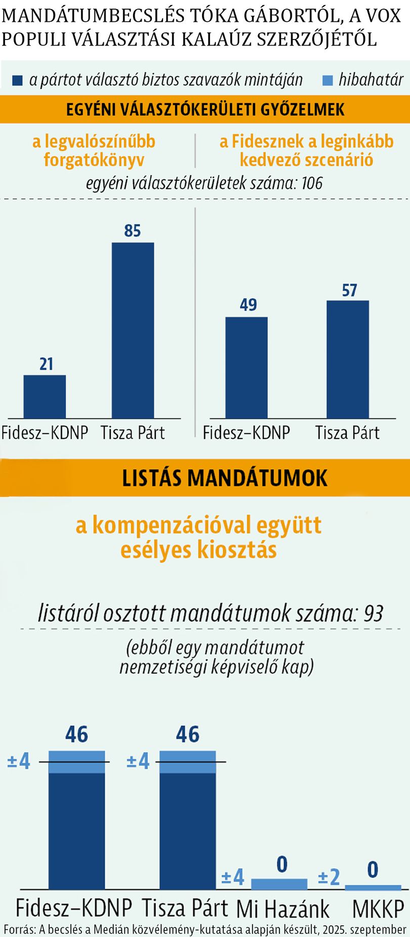 A hvg.hu-n ismertetett mandátumbecslés szerint Tóka Gábor jelenleg 91–95 százalékosra teszi annak valószínűségét, hogy a Tisza többségbe kerülne a 199 fős parlamentben, attól függően, hogy minden olyan válaszadót figyelembe vesz-e, aki pártot választott, vagy csak azokat közülük, akik a voksoláson való részvételüket biztosra mondják. Bár a választási szakértő a szakmai standardjai alapján tág hibahatárral számol, még így is alig lát olyan esetet, amelyben a Fidesz most több mandátumhoz jutna, mint a Tisza.