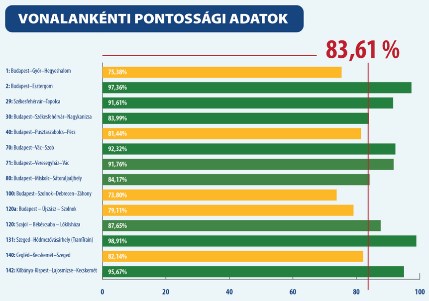 A hegyeshalmi, debreceni és pécsi vonalon késtek legtöbbet a vonatok. A 20 perc felett késő vonatok száma ismét 2,5% körül alakult és közel 100 millió forintot fizettek ki az utasoknak. A hónap folyamán értékesített vármegye- és országbérletek száma ismét átlépte az 1 milliót.