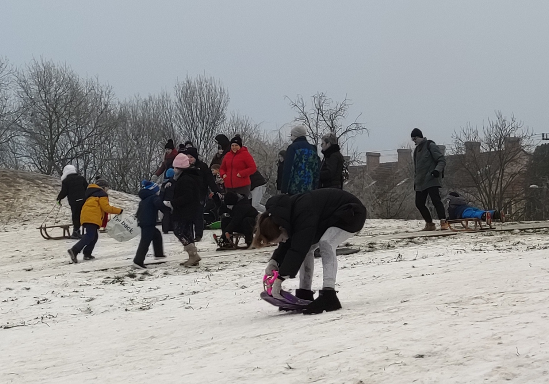 Nem volt egyedül: a dombtetőt gyerekek és szüleik népesítették be. Míg a kisebbek ismerkedtek a hóval, a nagyobbak rutinosan szánkóztak le a lejtő aljára, majd a szánkót maguk után húzva kapaszkodtak vissza a tetejére.