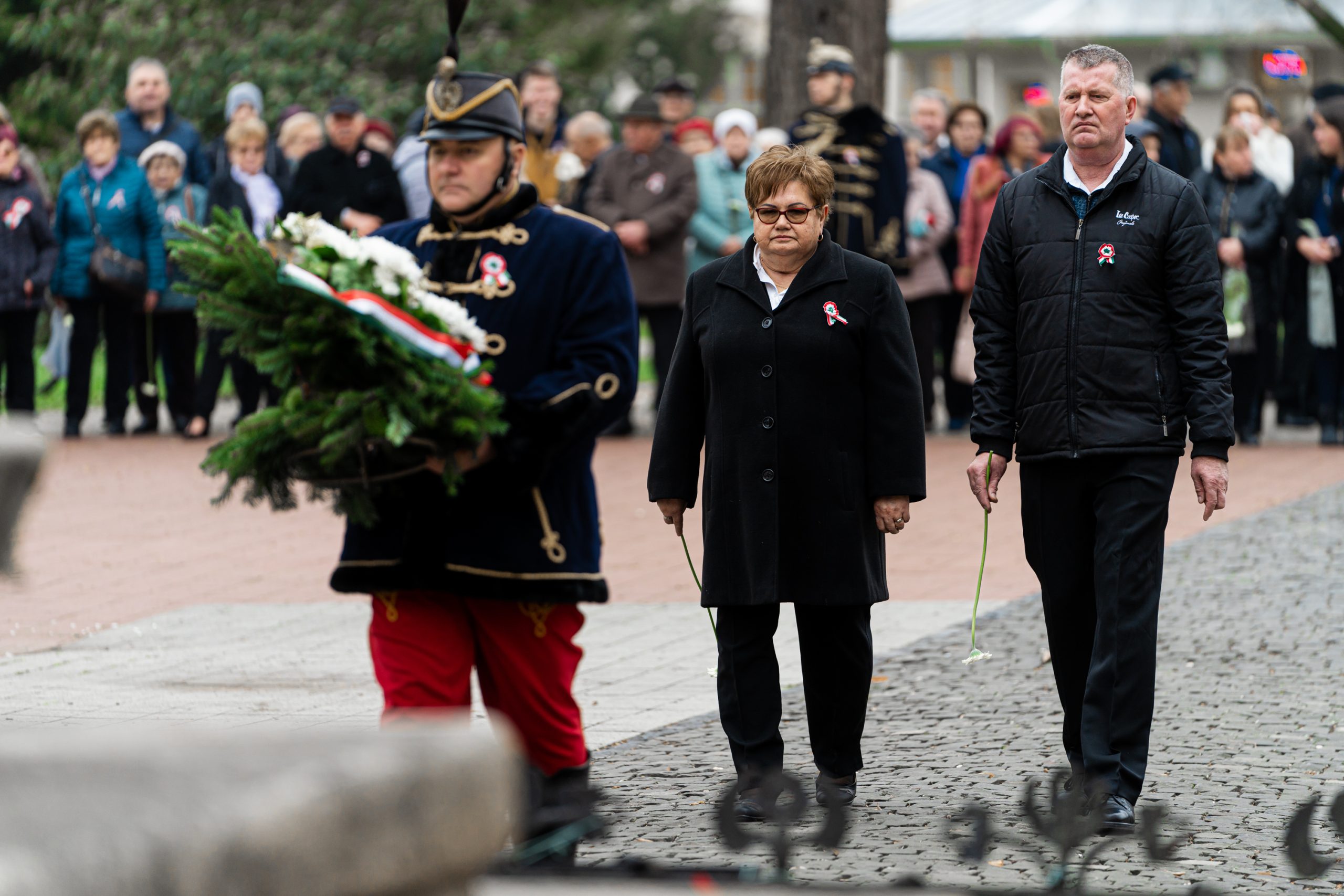 A Kossuth téri ünnepség a Péczely Attila Alapfokú Művészeti Iskola diákjainak előadásával folytatódott. Kóti Emma Róza a Magyar szívvel, lélekkel című verset szavalta el megragadó átérzéssel, majd a Csipogó csoport pörgős felcsíki táncokkal bűvölte el a jelenlévőket. A megemlékezés a koszorúk és virágok elhelyezésével zárult a Kossuth-szobornál.