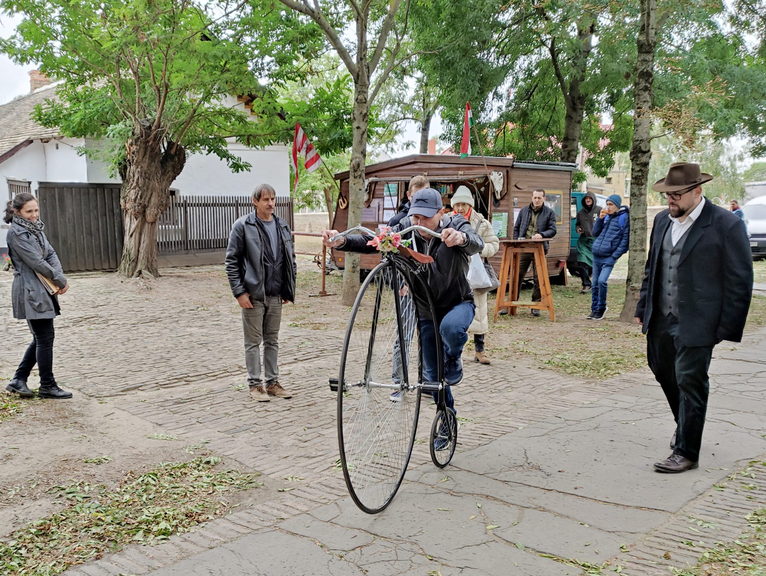 Az érdeklődők rácsodálkozhattak több kerékpárgyűjtő különleges darabjaira: a háromkerekű gyerekbiciklire és a mellette álló, egykor az urak kedvencének számító, hatalmas első kerekű velocipédre. Utóbbira nemcsak Béres Benedek, a jármű tulajdonosa pattant fel, hogy bemutasson vele egy kört, hanem a bátrabb érdeklődők is kipróbálhatták. Igaz, őket két markos legény, a két gyűjtő támogatta a szokatlan jármű használata közben – volt is rá okuk.