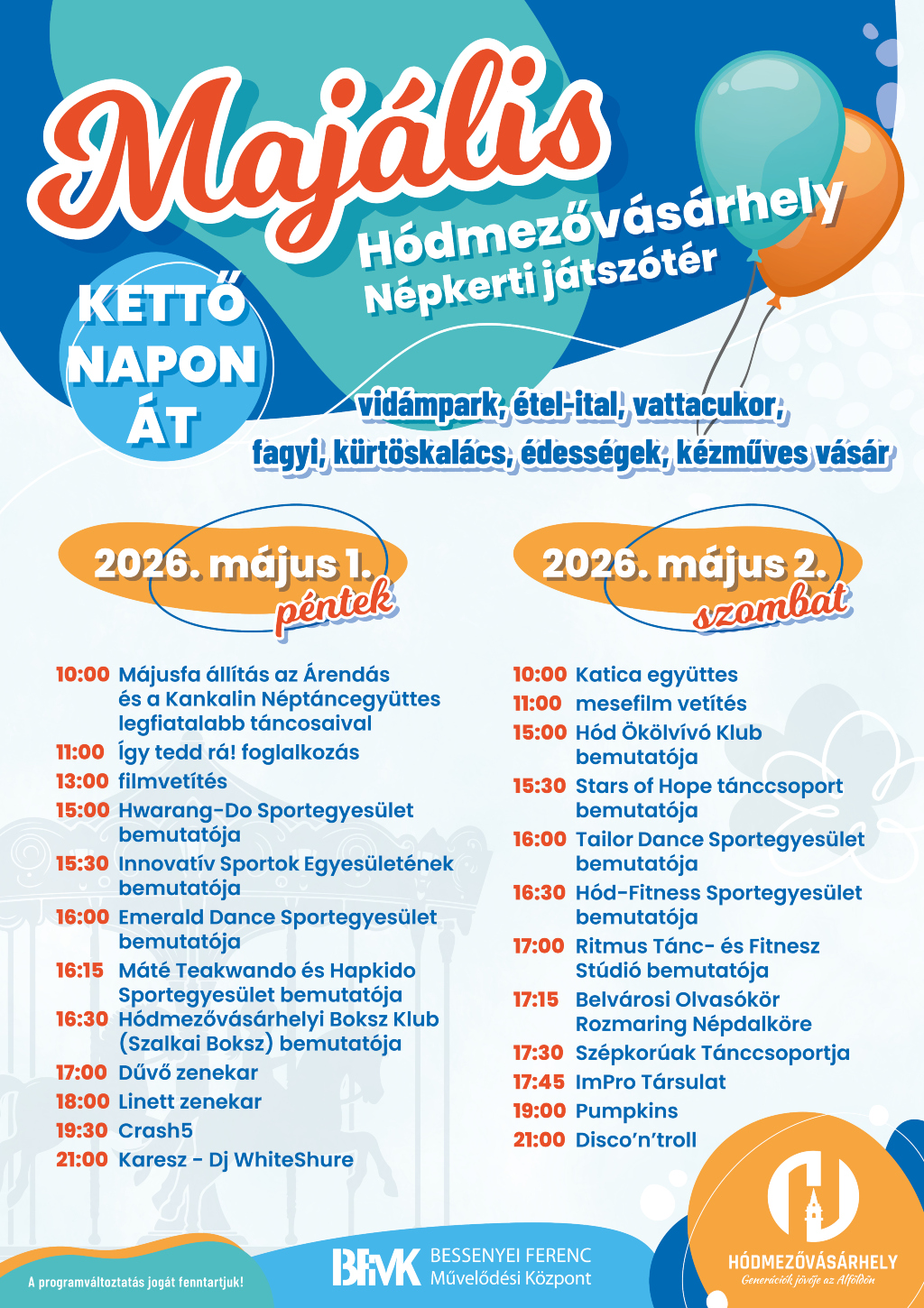A vidámpark mellett étel-ital, vattacukor, fagyi, kürtőskalács, kézművesek vására és sokszínű zenei kínálat is várja a majálisozni vágyókat.