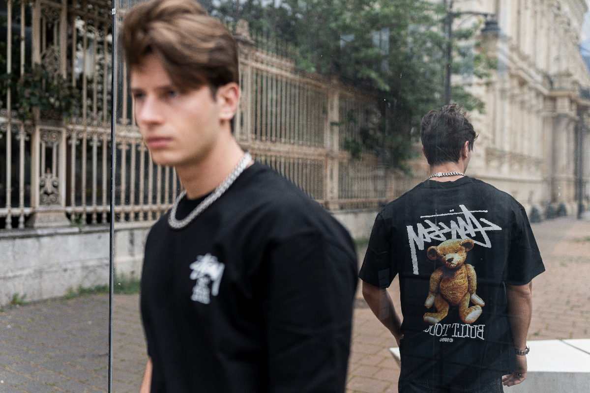 Egy Fear of God Essentials póló, egy Stüssy pulcsi és egy jól szabott nadrág együtt egy olyan alap streetwear szettet ad, amely egyszerre kényelmes, modern és időtálló.