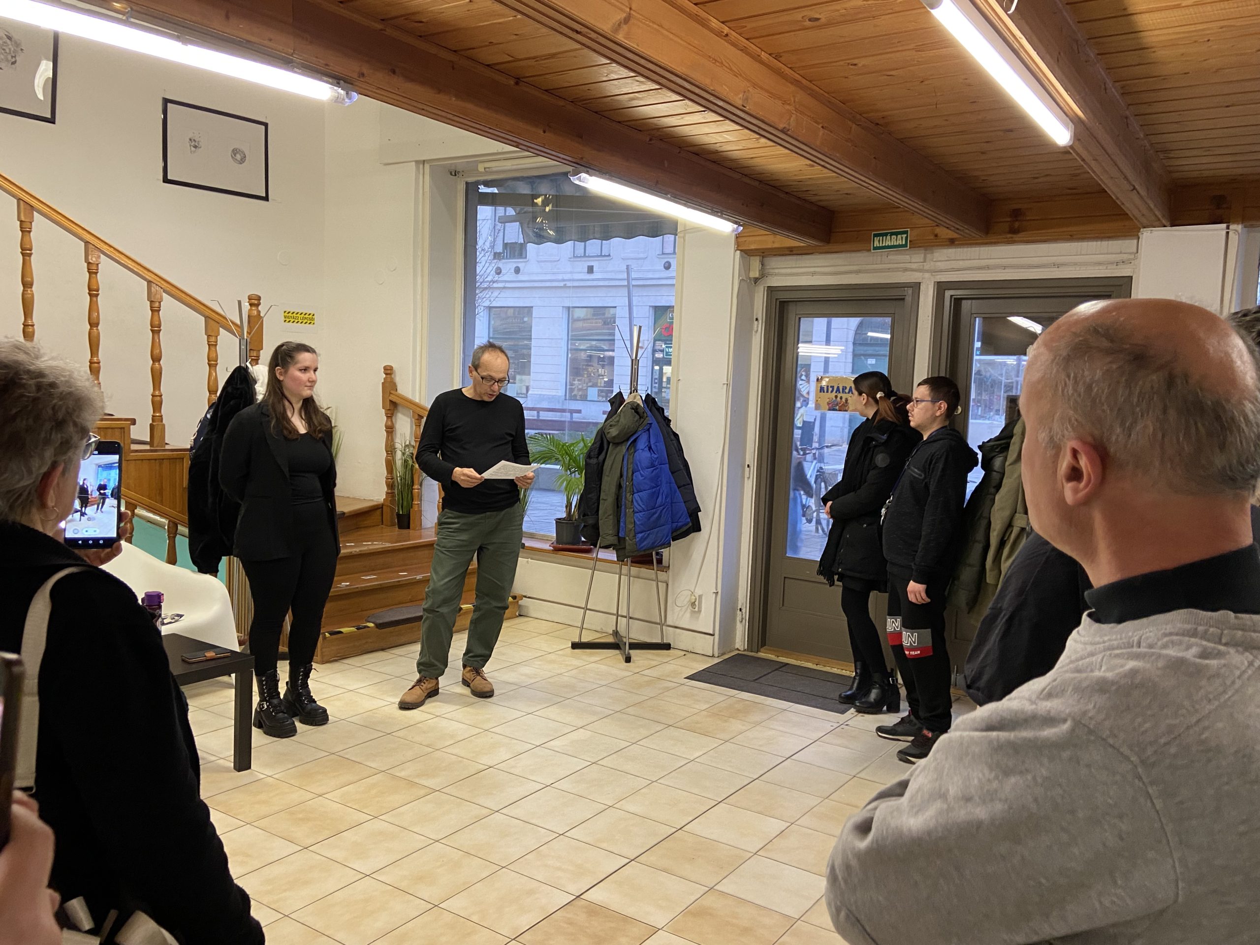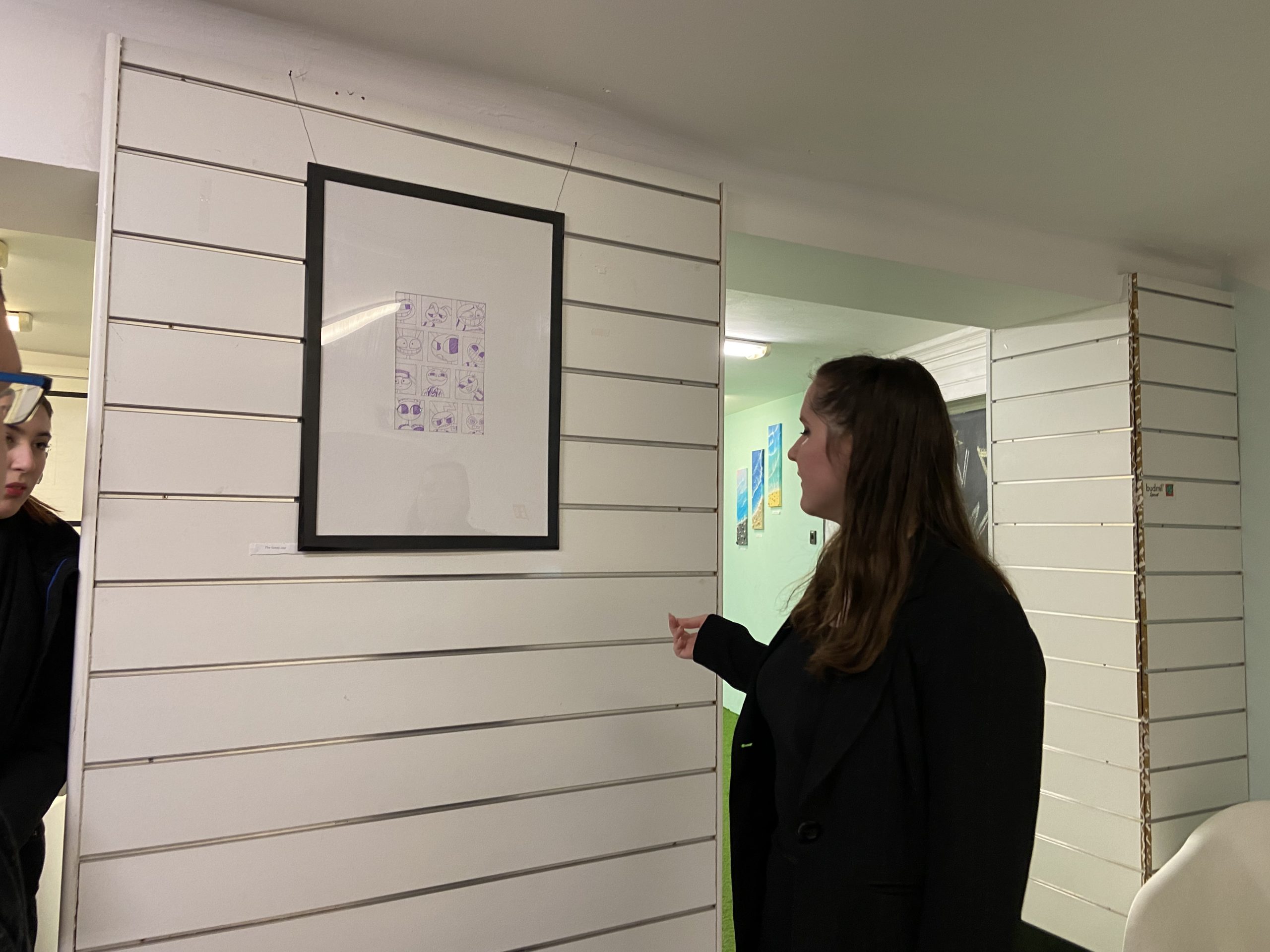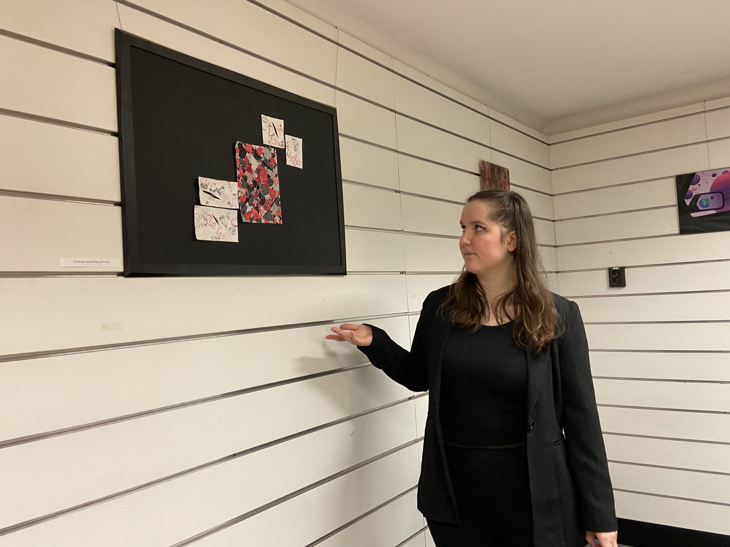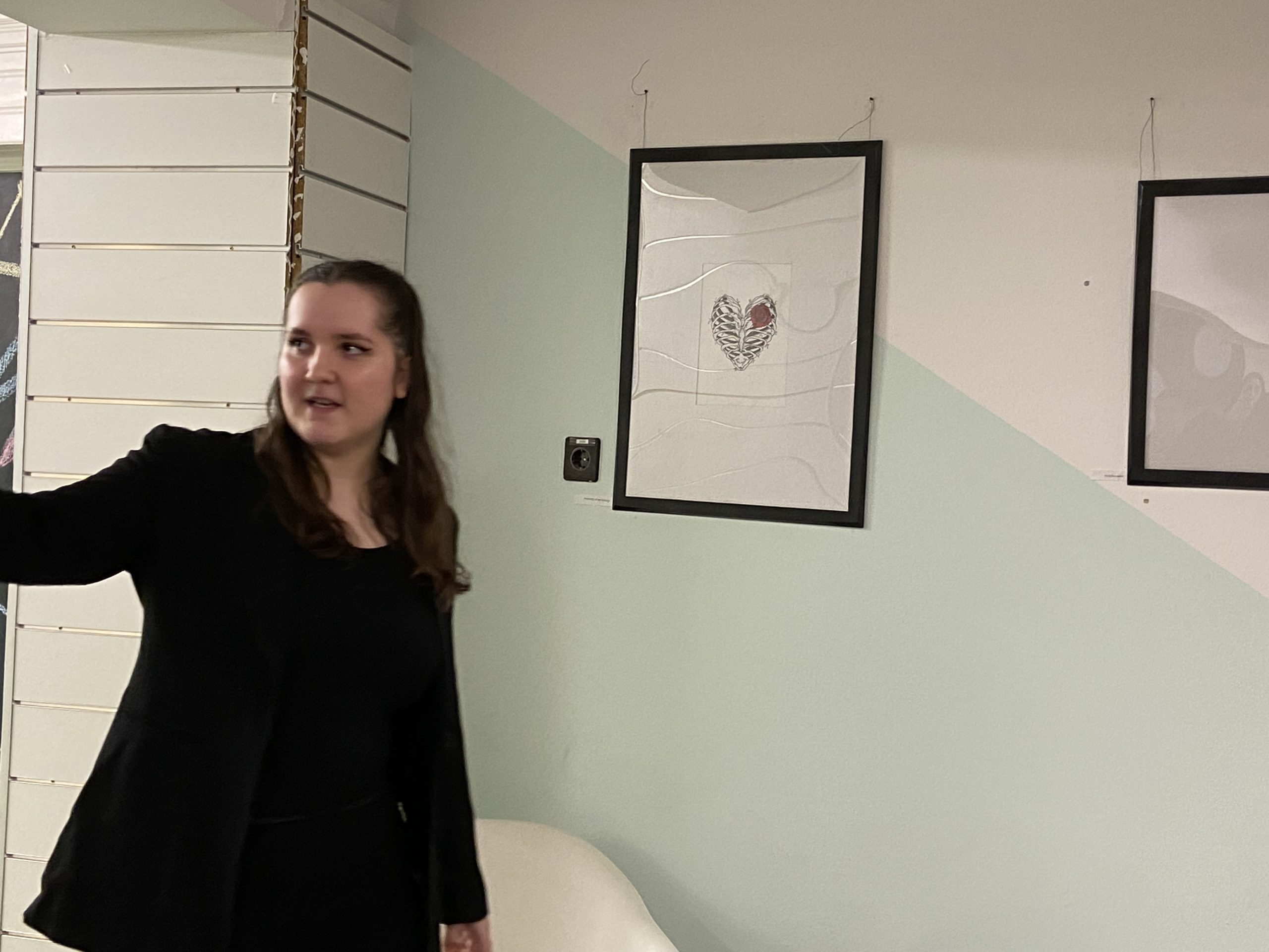 A köszöntést követően Viki az érdeklődő közönséggel egyenként ment végig minden egyes kiállított alkotáson, néhány szót, magyarázatot fűzve mindegyikükhöz. Megtudhattuk, műveiben egyaránt tükröződnek vissza animációs film-élményei, mint ahogyan a mindennapokban megélt örömei vagy nehézségei, kapcsolati tapasztalatai is: például a harag és a csalódás.