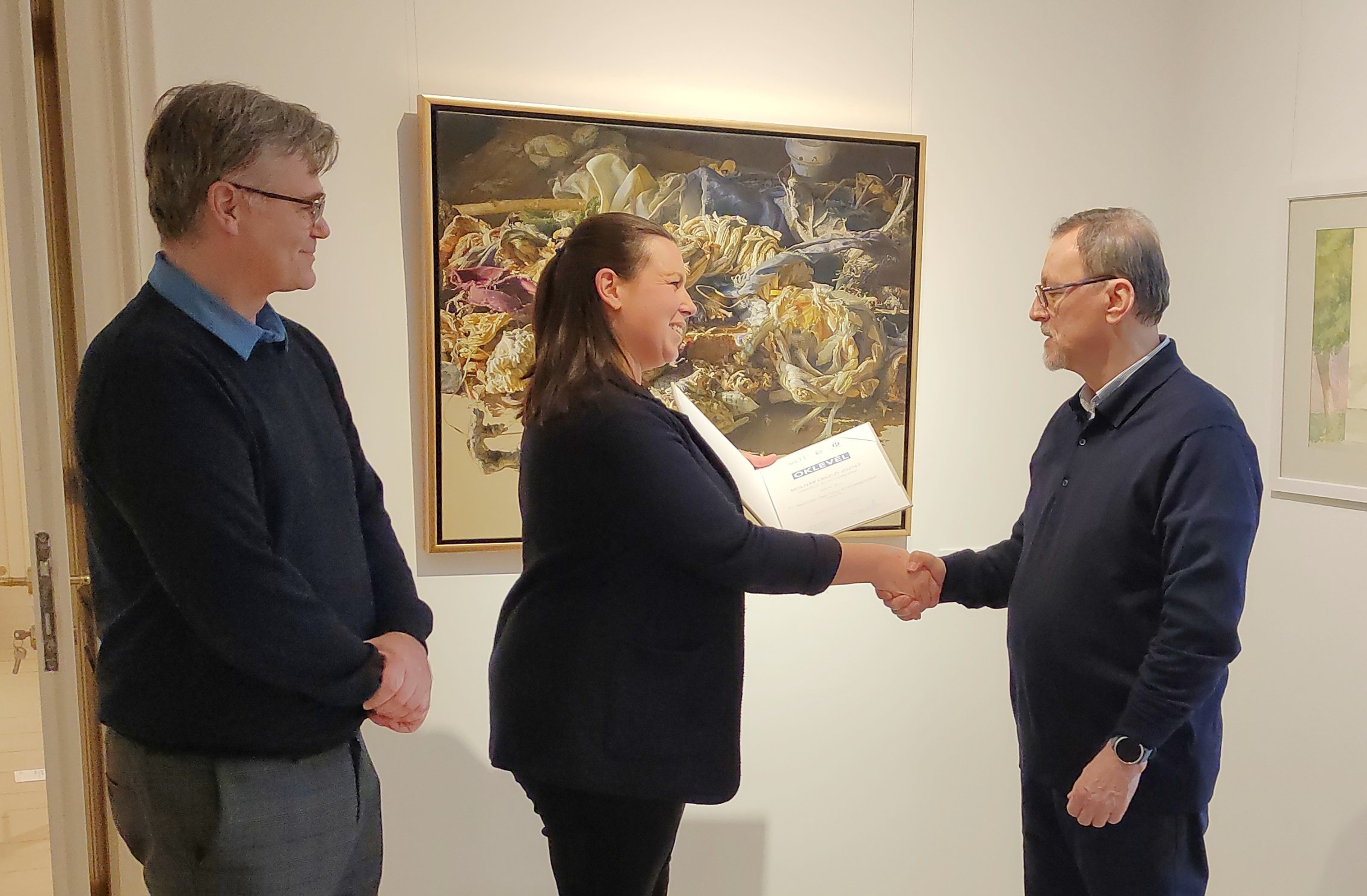 A Hódagro Zrt. által felajánlott közönségdíjat ma délelőtt, a vasárnap záruló Őszi Tárlaton adta át Gál Boglárka főigazgató és Nátyi Róbert, a tárlat kurátora Molnár László József grafikus-festőnek.