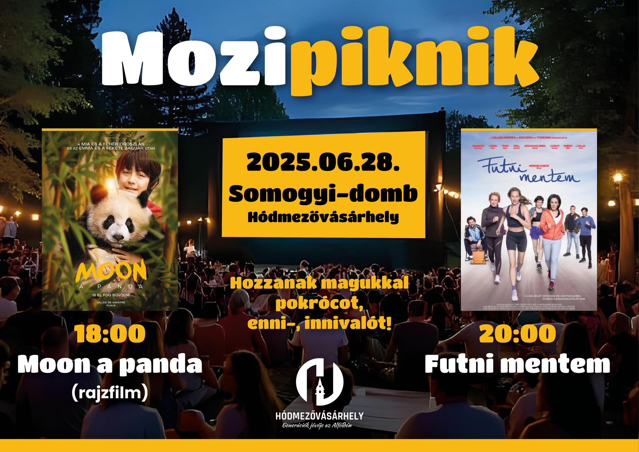 Június 28-án, szombaton délután 18 órától a Moon, a panda című családi vígjátékot, míg 20 órától a nagysikerű Futni mentem c. filmet nézhetjük meg a Somogyi-domb oldaláról.