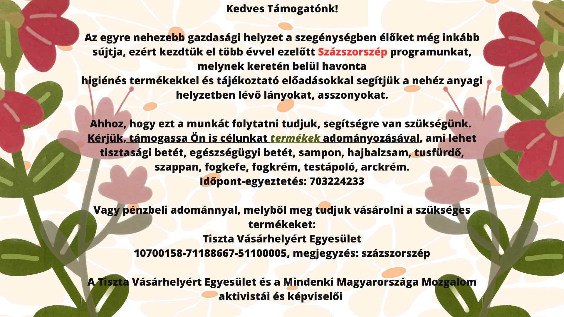 Már több mint két és fél éve segíti higiénés termékekkel és tájékoztató előadásokkal a Százszorszép program Vásárhelyen a nehéz anyagi helyzetben lévő lányokat, asszonyokat. Ahhoz, hogy folytatni tudják, támogatásra van szükségük, ezért gyűjtést indítanak.