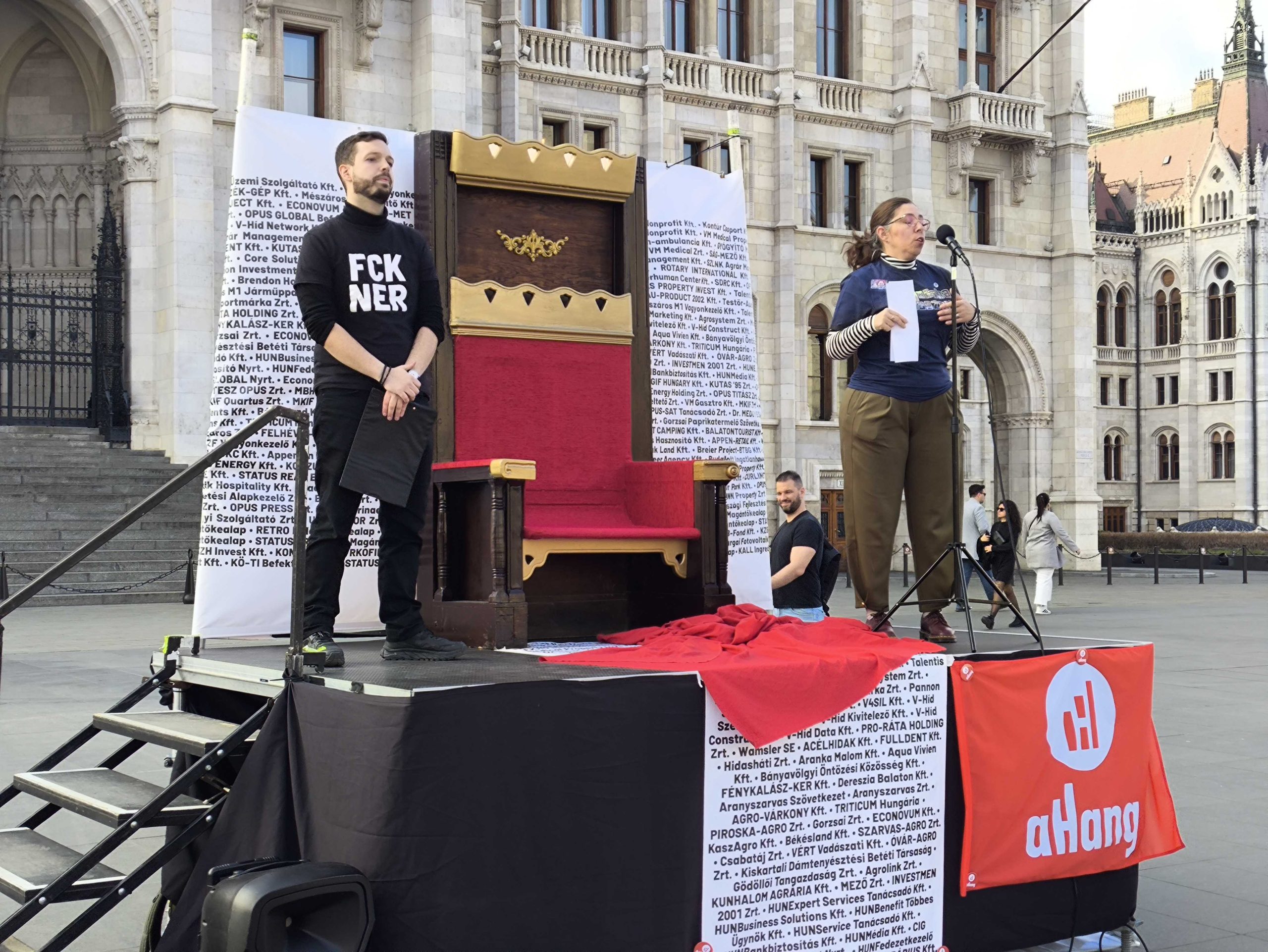 Több programelemmel is készültek a szervezők. A Kossuth tér közepére elhelyeztek egy színpadot, amelyen egy több méter magas, bársonyborítású trón állt, mögötte pedig egy Mészáros Lőrinc több száz cége van felsorolva. A színpadra bárki felmehetett, és készíthetett egy szelfit az “oligarcha trónból”, a parlament hátterével.