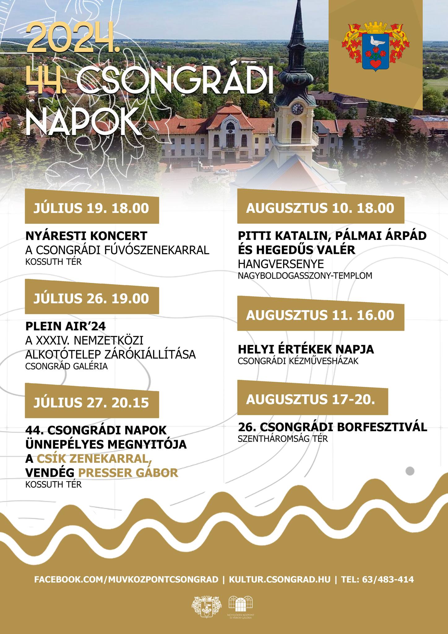 A városi kultúrház által közzétett programterv szerint a nyitónapon 18 órától a Csongrádi Fúvószenekar nyáresti koncertjét hallgathatják meg az érdeklődők a Kossuth téren, egy héttel később, július 26-án pénteken 19 órától a Plein Air’24, a XXXIV. Nemzetközi Alkotótelep zárókiállítását tekinthetik meg a Csongrád galériában.