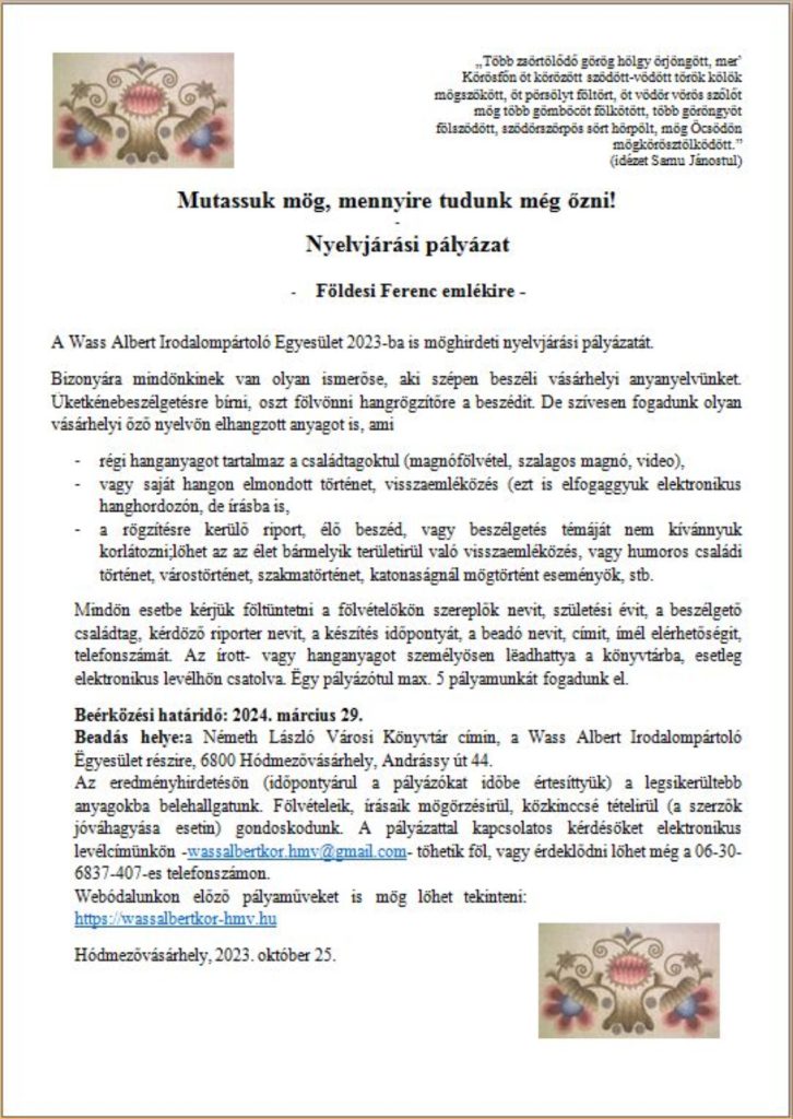 Nyelvjárási pályázatot hirdet a Wass Albert Irodalompártoló Egyesület